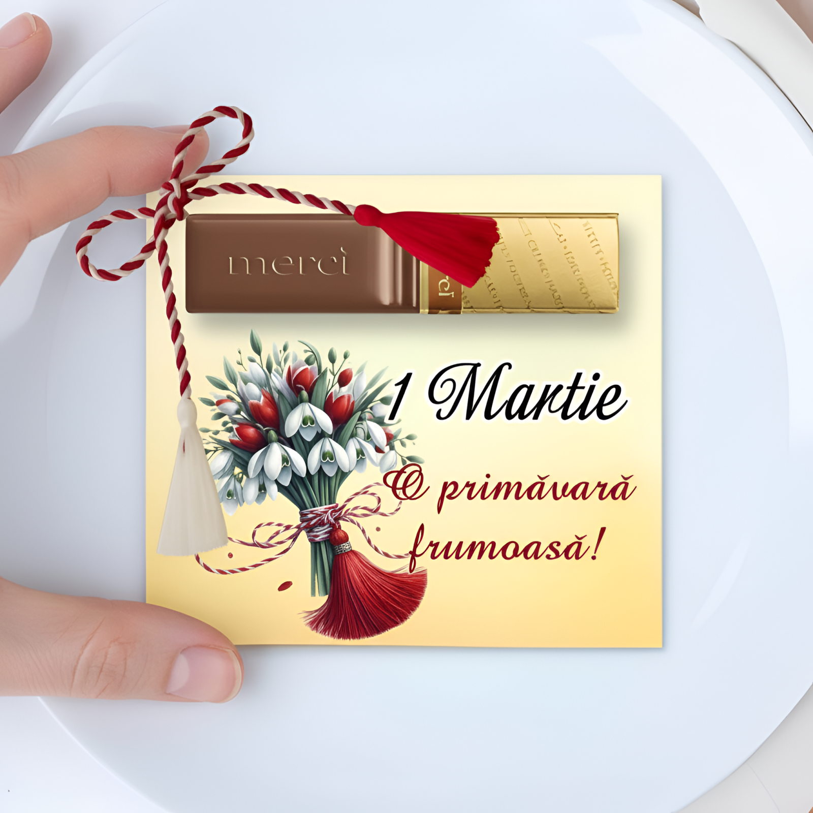 • Prindere elegantă: Cartonașul este legat cu șnur de martisor satinat,