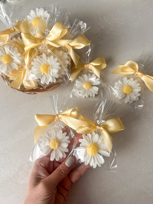 MARTISOR - lumanare in formă de margareta - simbol al primăverii cu diametru de 5,5 cm, turnată manual din ceară de soia  cu fitil din bumbac organic.Surprinde-o cu un mărțișor cu totul special- o lumânare din ceara soia ambalata elegant intr-o cutiuta de carton asortata.