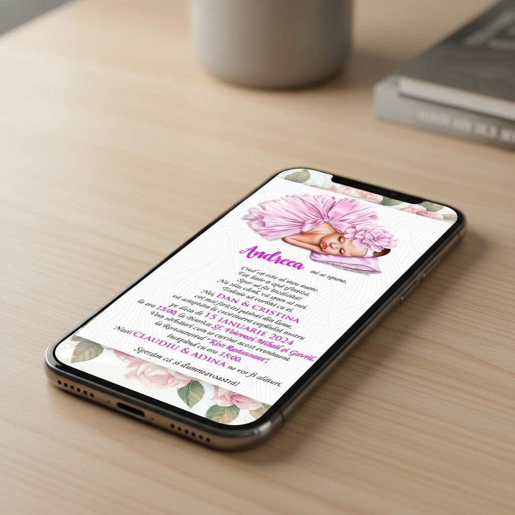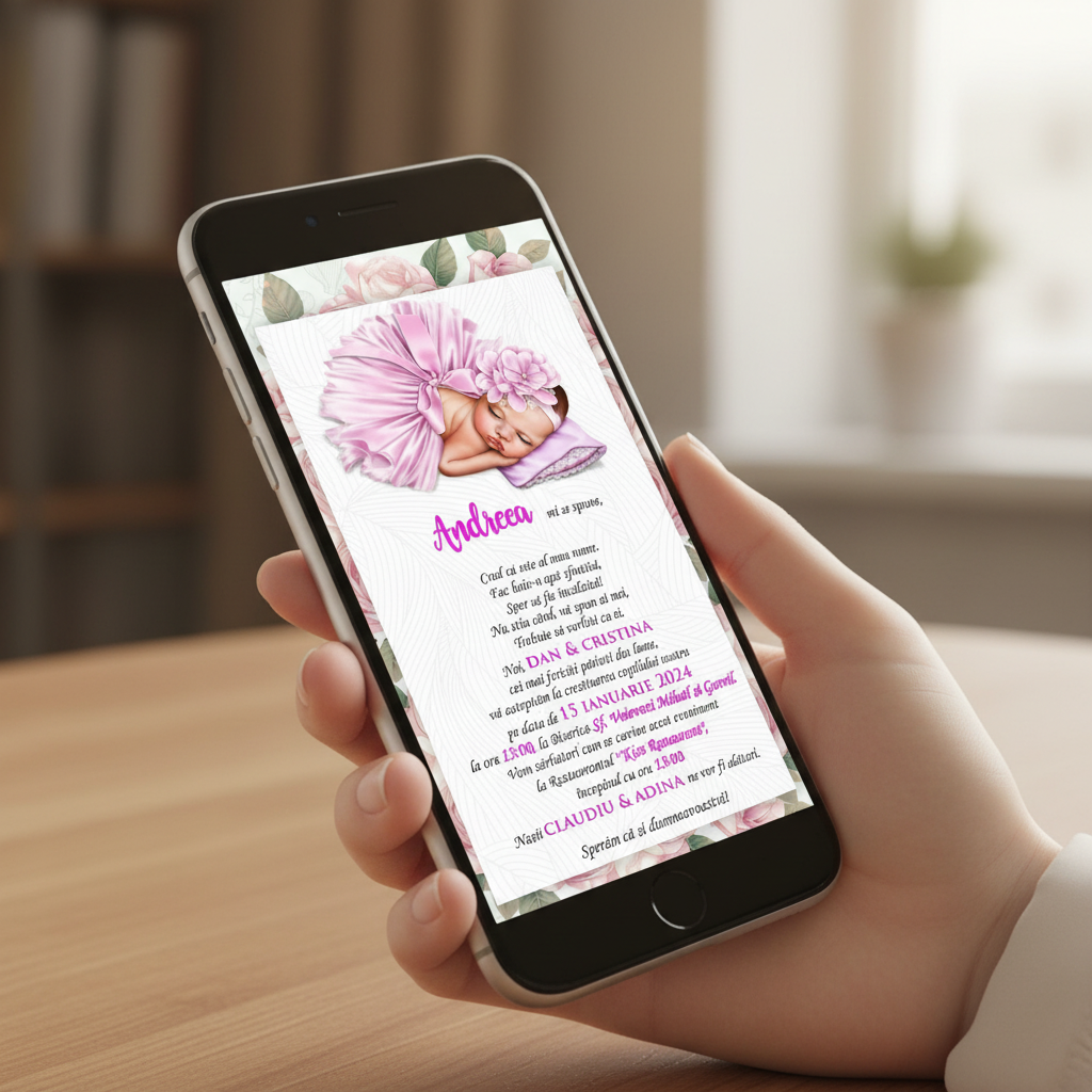 ✨ Invitatiile electronice sunt alegerea ideală pentru a economisi timp și bani! 💸⏳ Le poți trimite rapid și ușor pe Facebook sau WhatsApp, astfel încât toți invitații să fie la curent cu evenimentul vostru special! 💌🎉