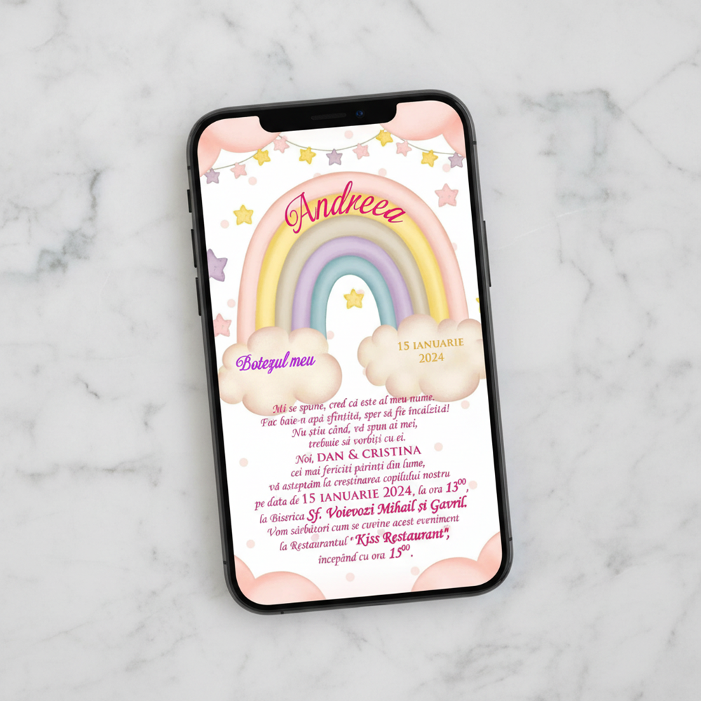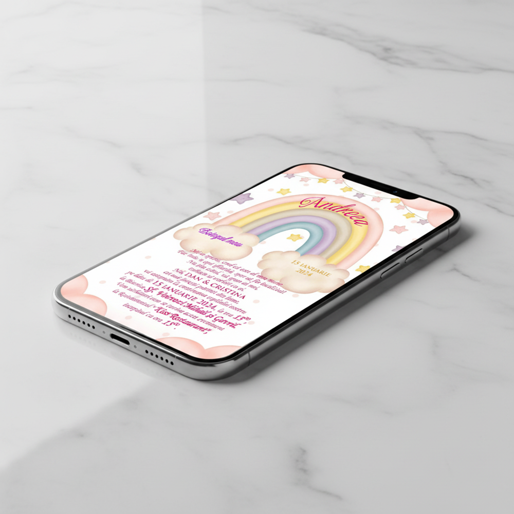 ✨ Invitatiile electronice sunt alegerea ideală pentru a economisi timp și bani! 💸⏳ Le poți trimite rapid și ușor pe Facebook sau WhatsApp, astfel încât toți invitații să fie la curent cu evenimentul vostru special! 💌🎉