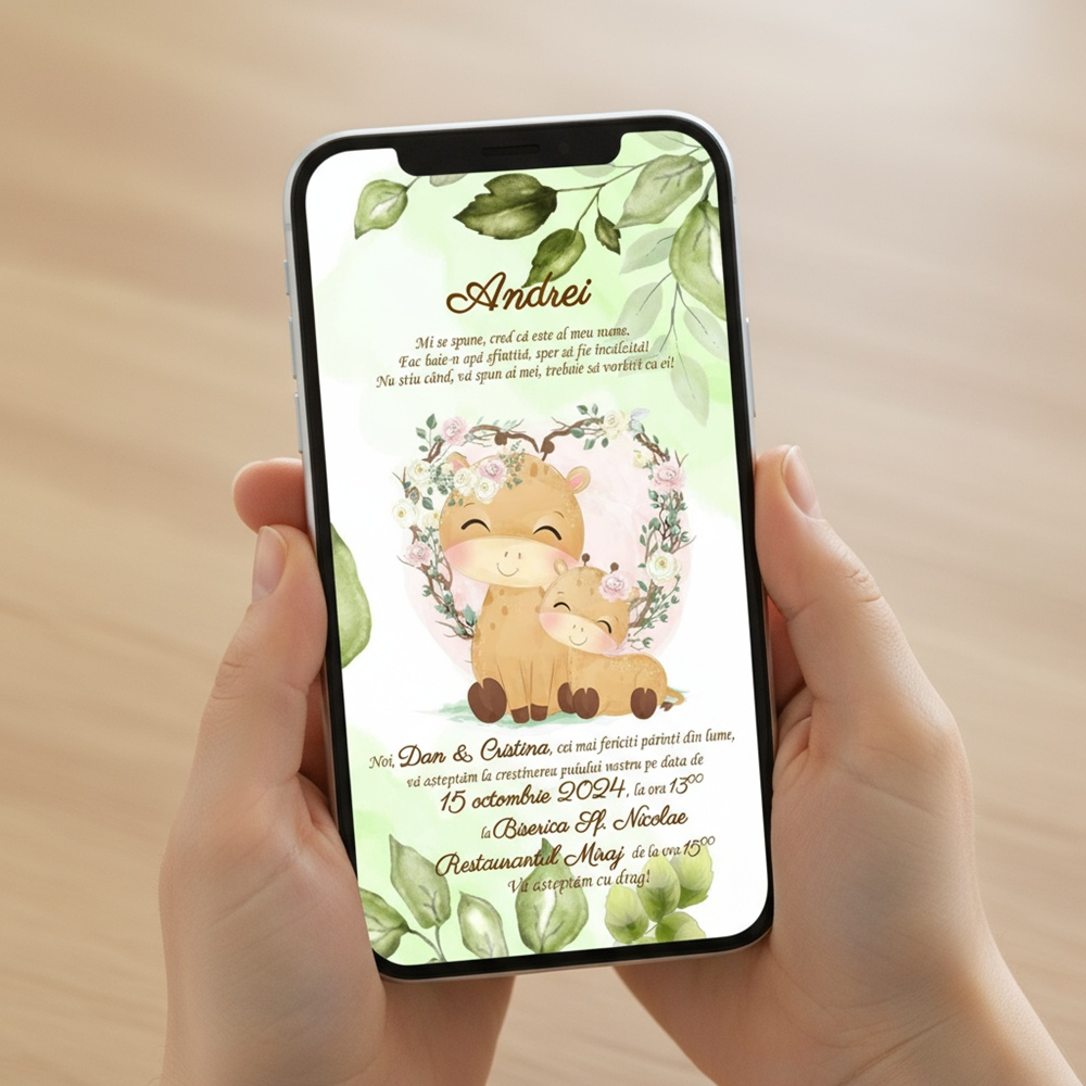 ✨ Invitatiile electronice sunt alegerea ideală pentru a economisi timp și bani! 💸⏳ Le poți trimite rapid și ușor pe Facebook sau WhatsApp, astfel încât toți invitații să fie la curent cu evenimentul vostru special! 💌🎉