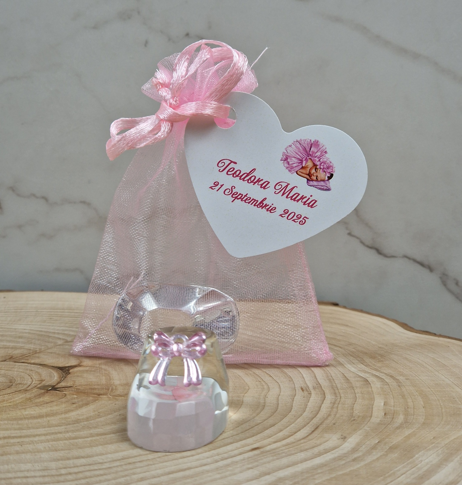 Marturie de botez - un botosel de bebelus realizat din cristal si accesorizat cu o fundita de culoare roz.
