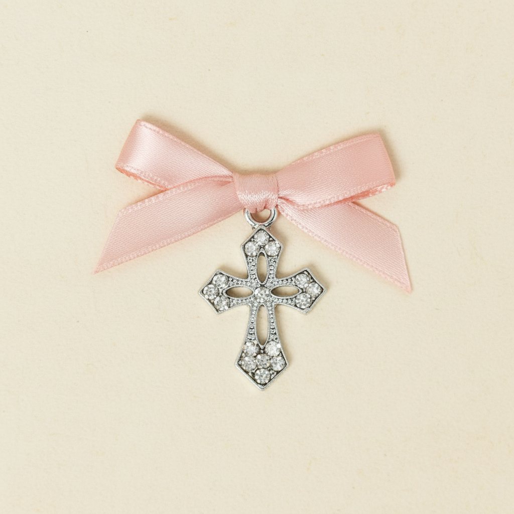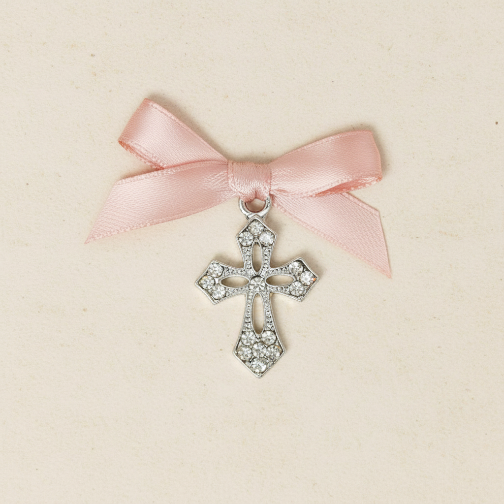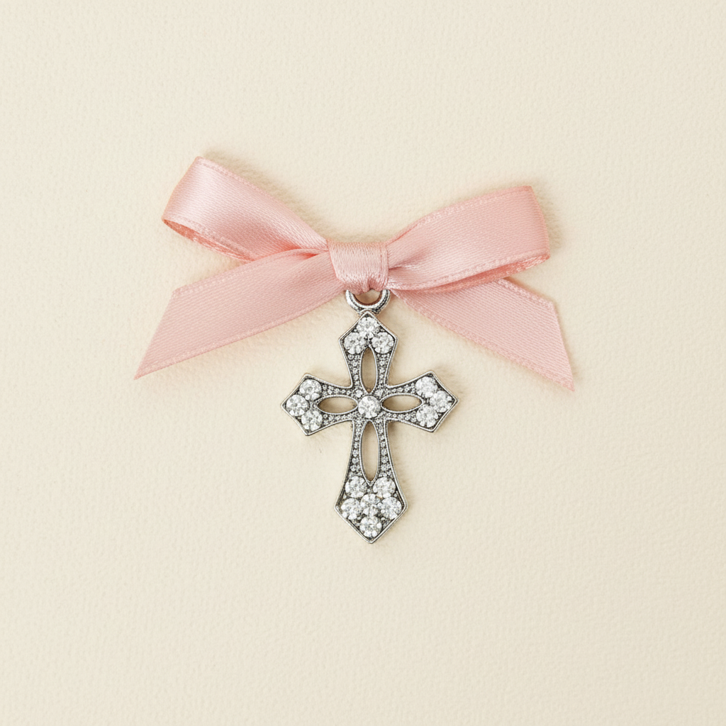 Cruciulita de botez metalica  decorata cu pietricele albe la colturi la care se ataseaza o funda de organza.