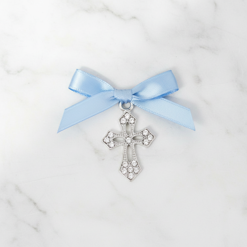 Cruciulita de botez metalica  decorata cu pietricele albe la colturi la care se ataseaza o funda de organza.