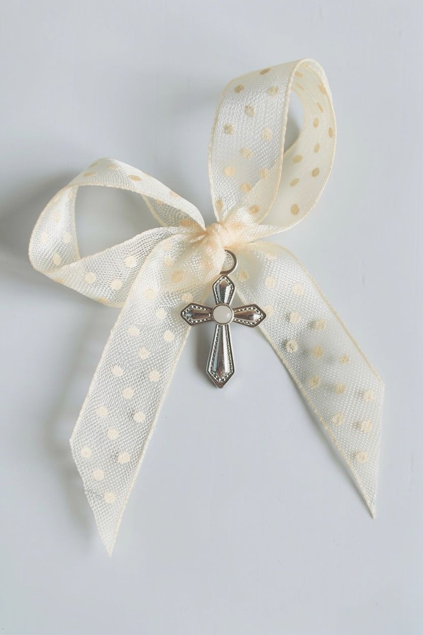 Cruciulite de botez pentru baieti cu forma deosebita. Cruciulitele sunt realizate din metal nichelat si sunt accesorizate cu fundite din organza de diferite culori. In cadrul slujbei de botez, fiecare invitat primeste o cruciulia de botez accesorizata cu o fundita colorata.