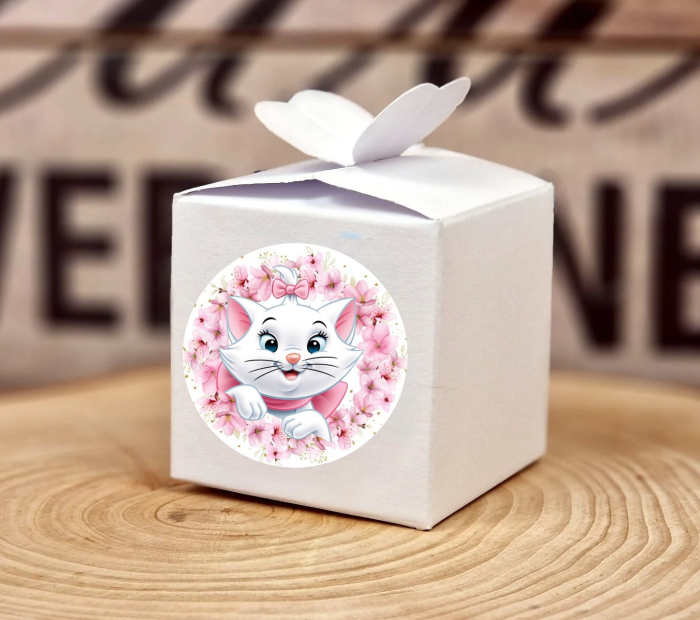 Cutiile sunt accesorizate cu un sticker cu pisicuta.