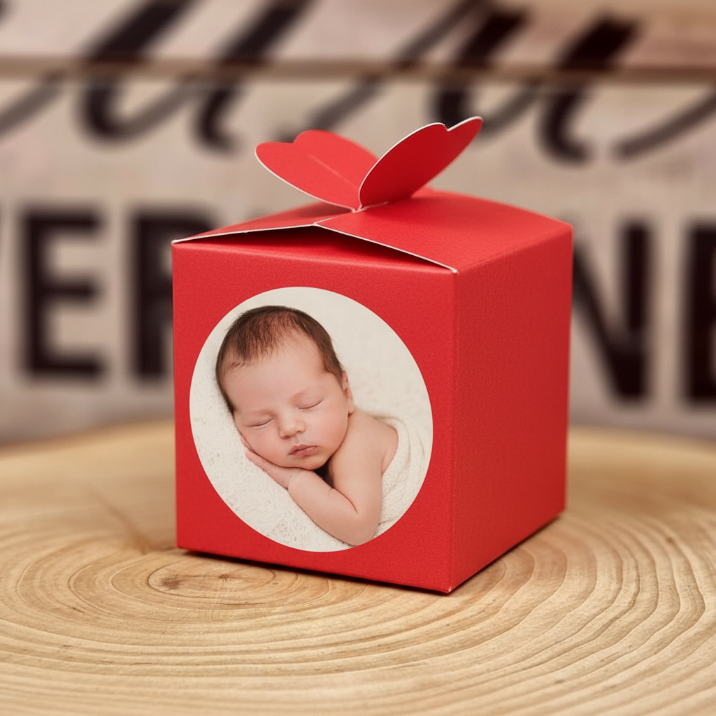 Cutiile sunt accesorizate cu un sticker cu un bebelus tinut in brate de o barza.