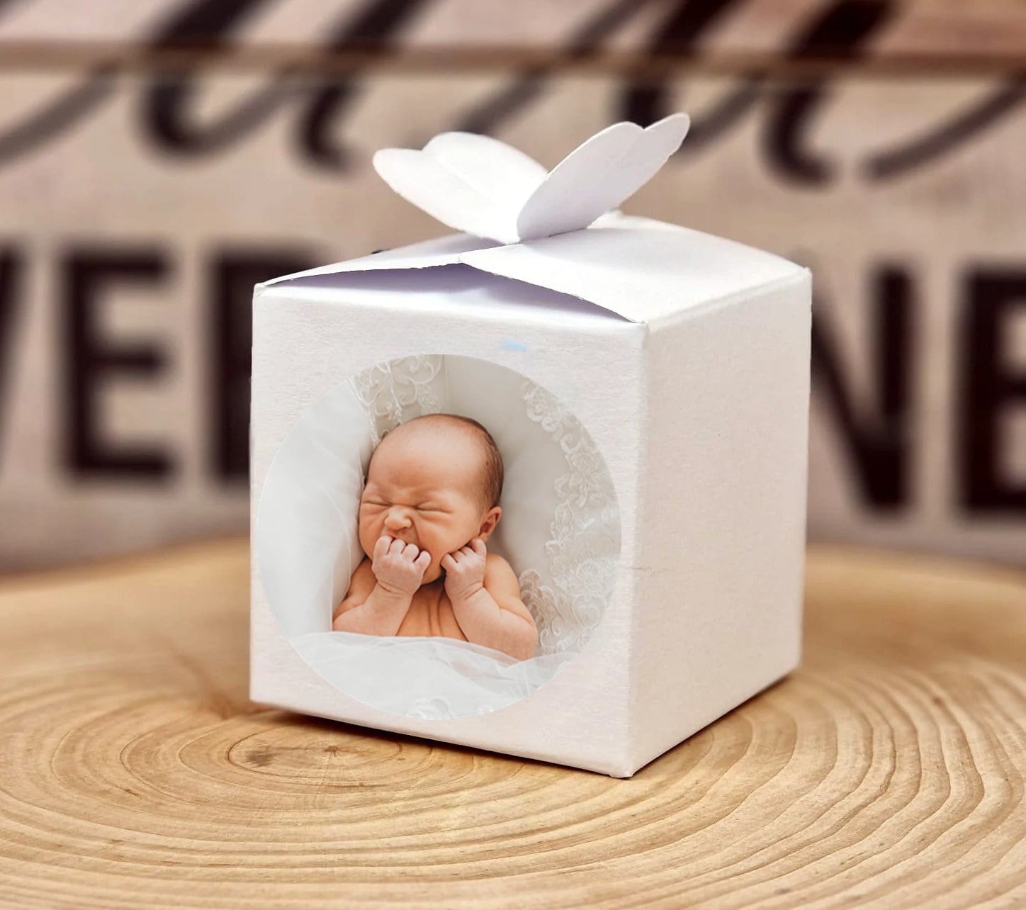 Cutiile sunt accesorizate cu un sticker cu un bebelus tinut in brate de o barza.