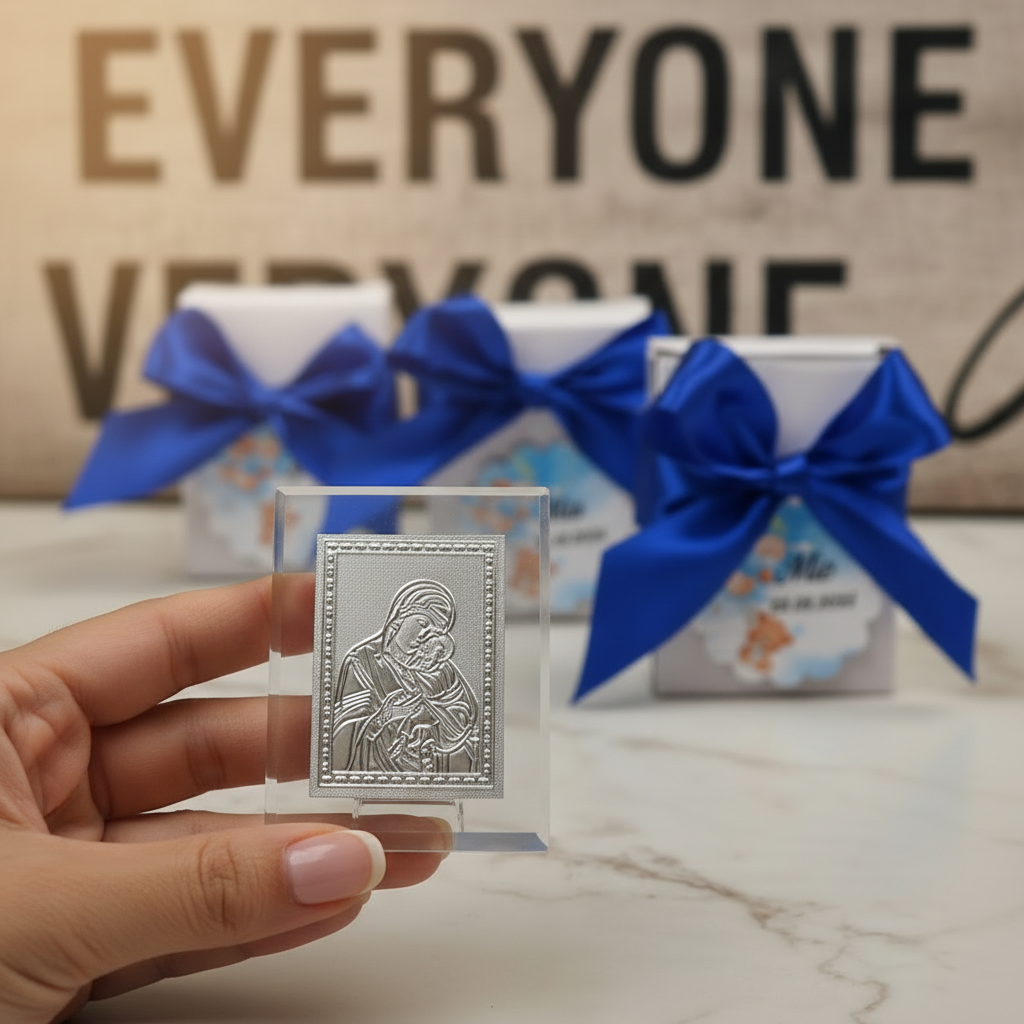 Iconita din sticla cu Fecioara Maria si  pruncul Iisus este o marturie de botez potrivita pentru orice botez. Iconita este realizata din sticla iar reprezentarea este din metal