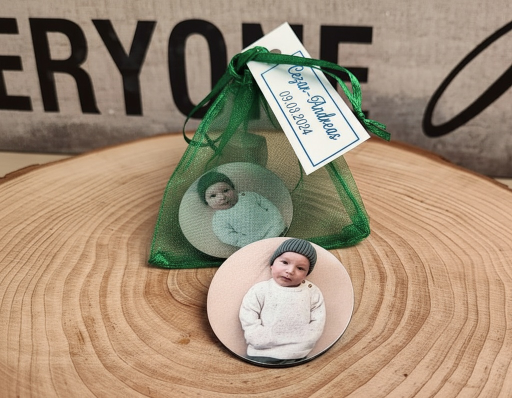 Magnet foto rotund in saculet de organza.