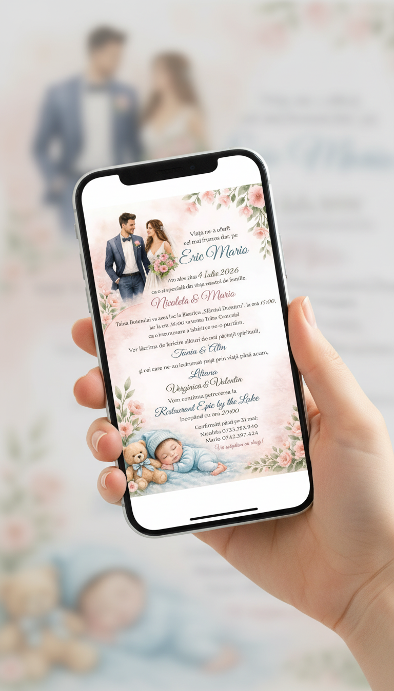 ✨ Invitatiile electronice sunt alegerea ideală pentru a economisi timp și bani! 💸⏳ Le poți trimite rapid și ușor pe Facebook sau WhatsApp, astfel încât toți invitații să fie la curent cu evenimentul vostru special! 💌🎉