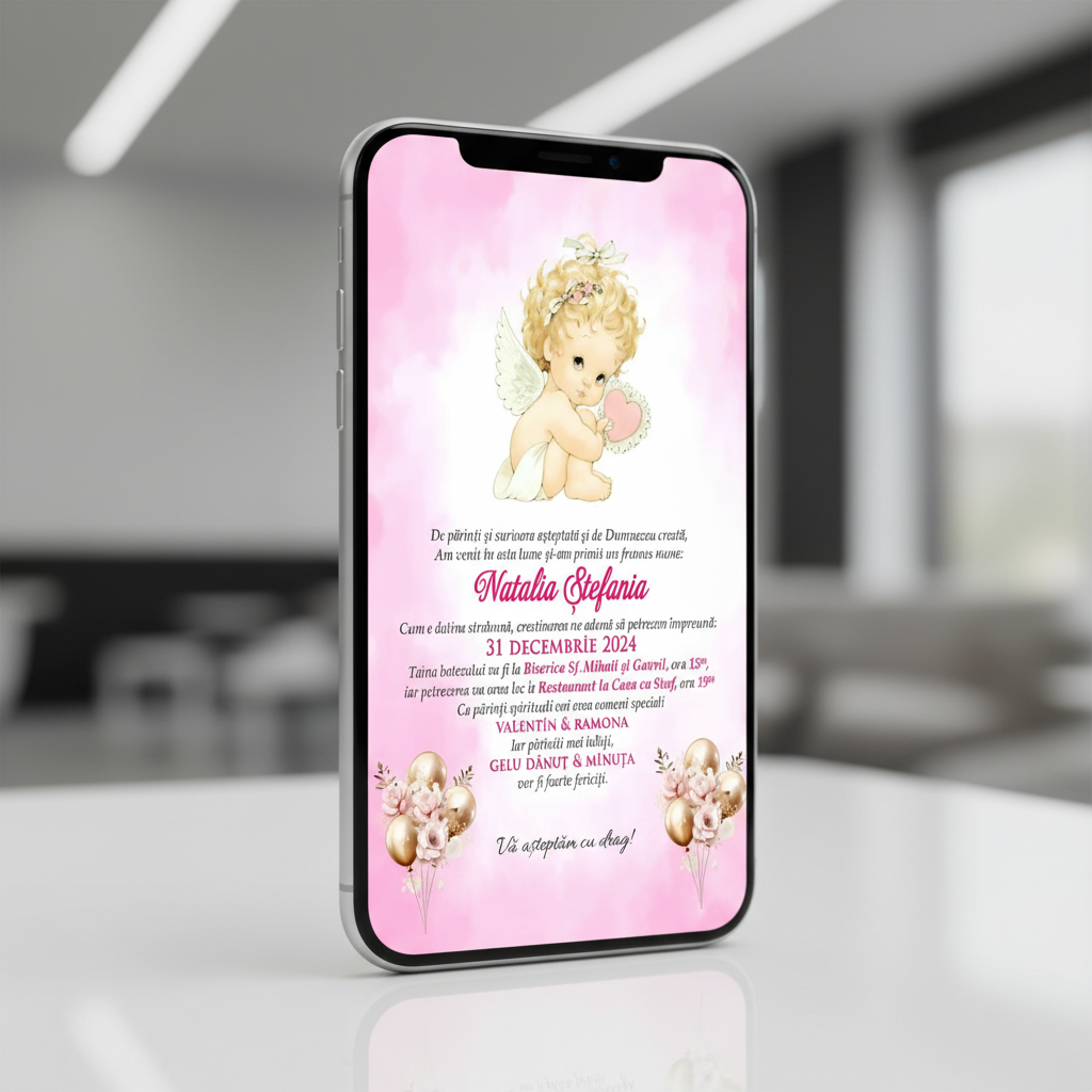 Este o invitatie tip poza de rezolutie mare pe care o puteti trimite pe facebook sau whats app celor cu care nu va puteti intalni fizic sa le dati invitatia.