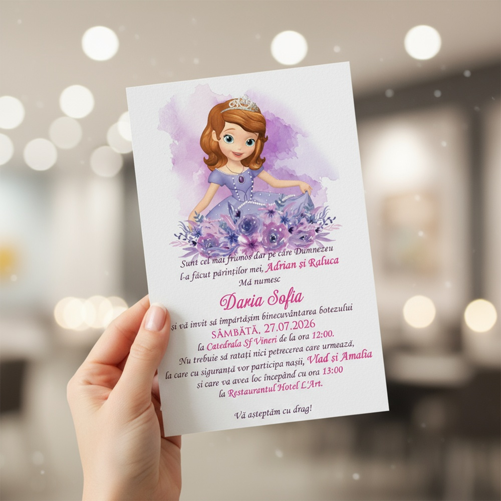 Invitatie de botez cu PRINTESA SOFIA realizata din carton ALB sidefat gros (250 gr)