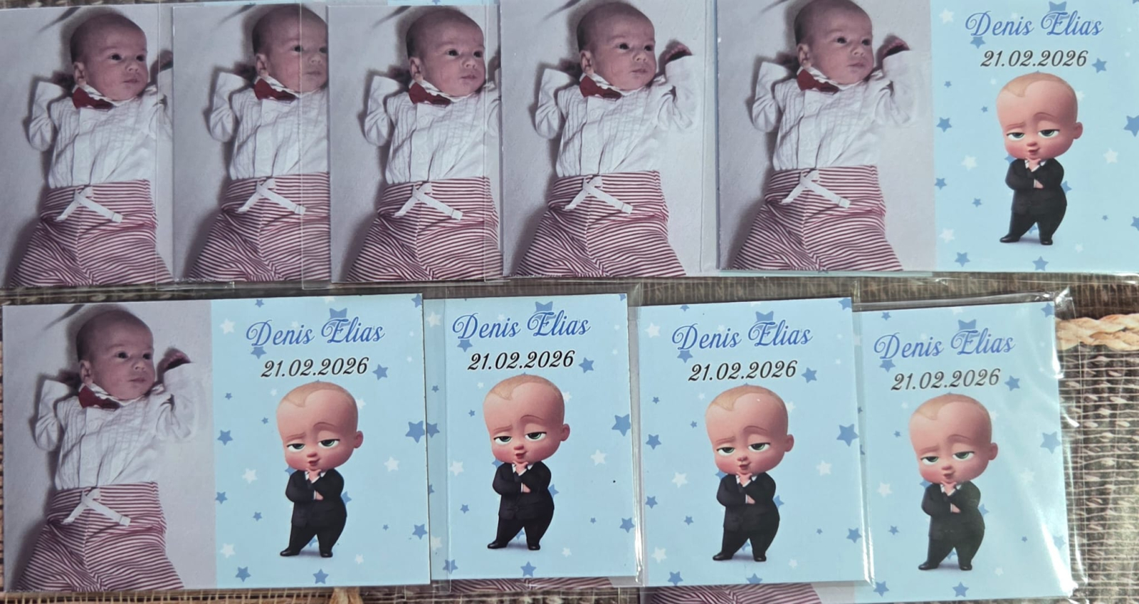sunt personalizati cu poza, numele si data evenimentului tau.