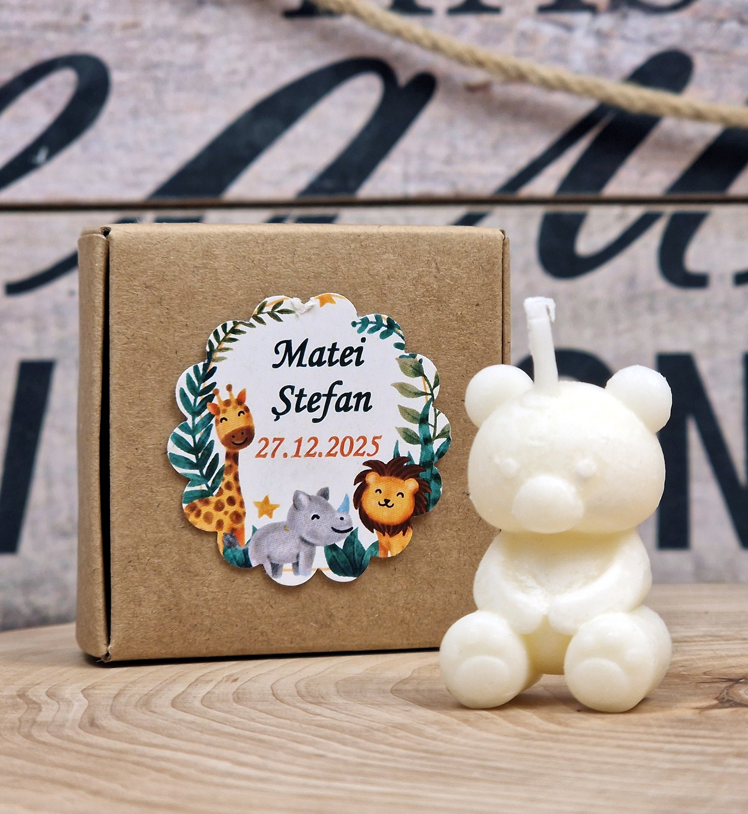 Lumânările în formă de ursulet separat, cutiile pliate, etichetele si dublu adezivul pt lipirea etichetelor separat și le veți asambla dvs ca în poza de prezentare după modelul pe care vi-l trimitem in colet.