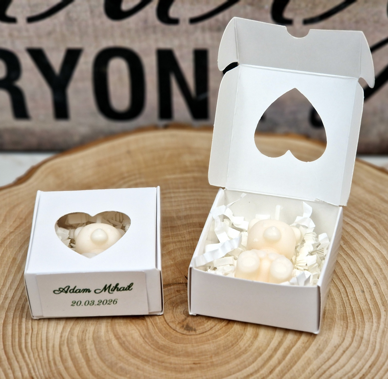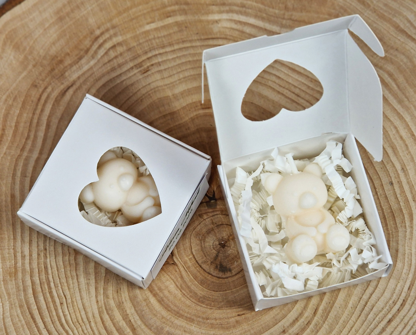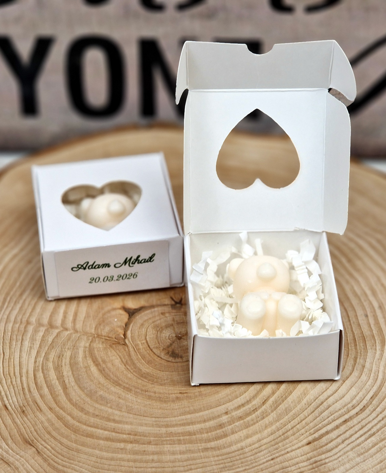 Lumânările în formă de ursulet separat, cutiile pliate, etichetele si dublu adezivul pt lipirea etichetelor separat și le veți asambla dvs ca în poza de prezentare după modelul pe care vi-l trimitem in colet.