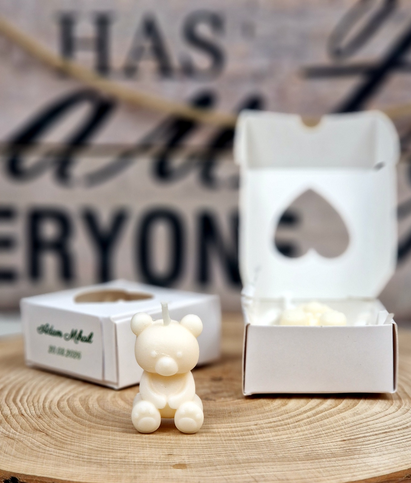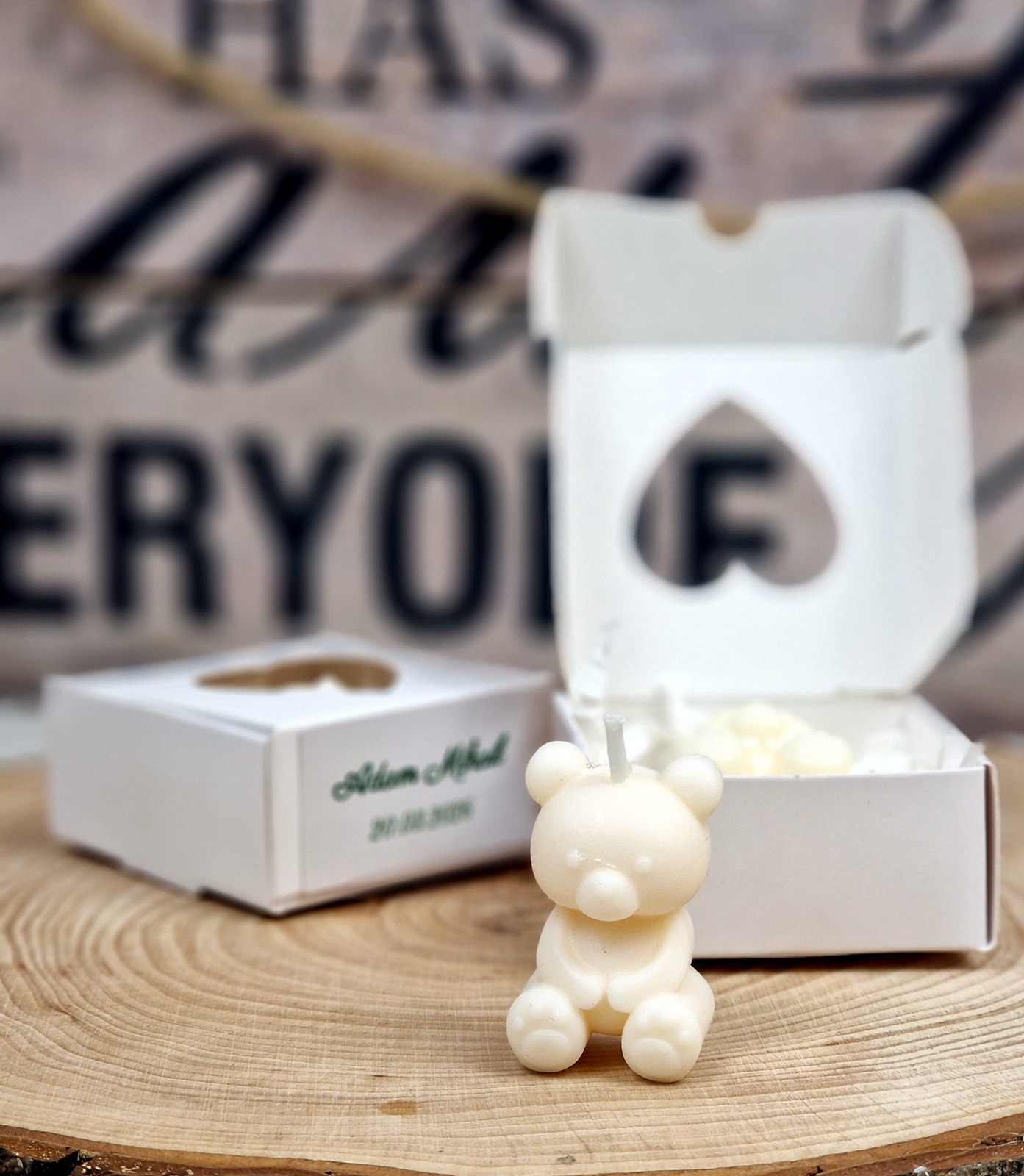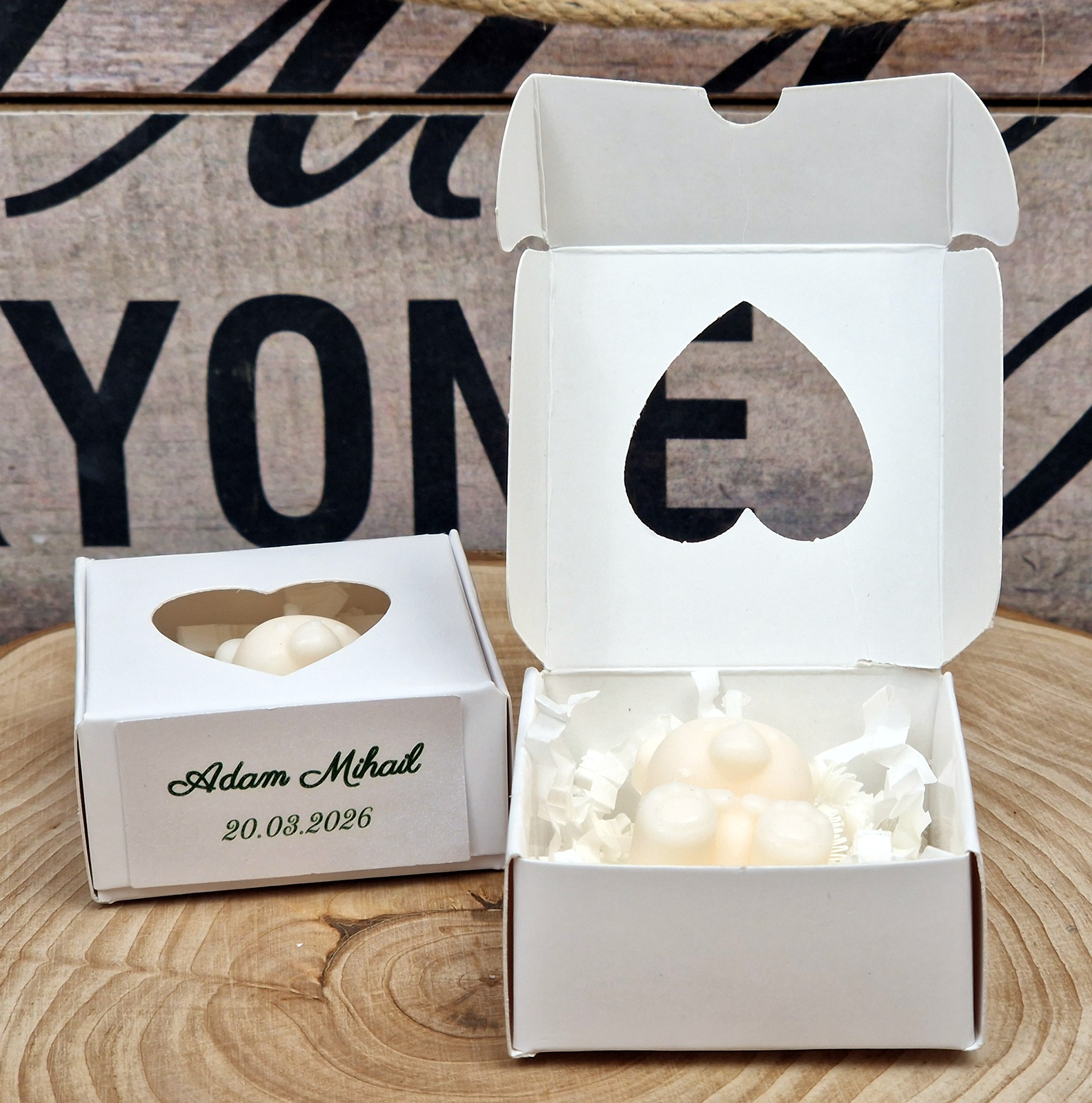 Lumânările în formă de ursulet separat, cutiile pliate, etichetele si dublu adezivul pt lipirea etichetelor separat și le veți asambla dvs ca în poza de prezentare după modelul pe care vi-l trimitem in colet.