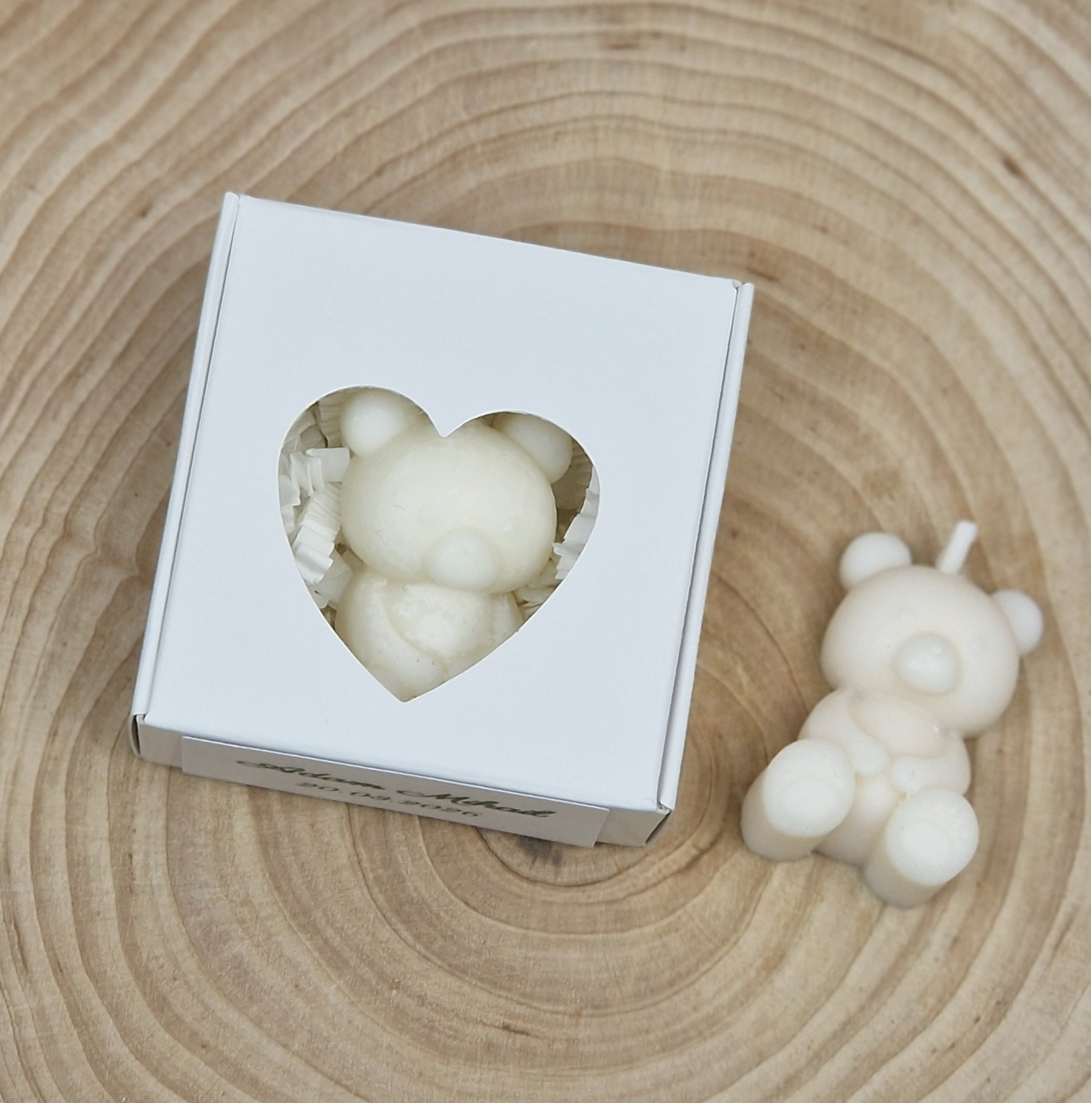 Surprinde-ți invitații cu o marturie de botez speciala - o mini lumânare din ceara soia in forma de ursulet personalizata si ambalata elegant intr-o cutiuta alba cu fereastra in forma de inimioara.