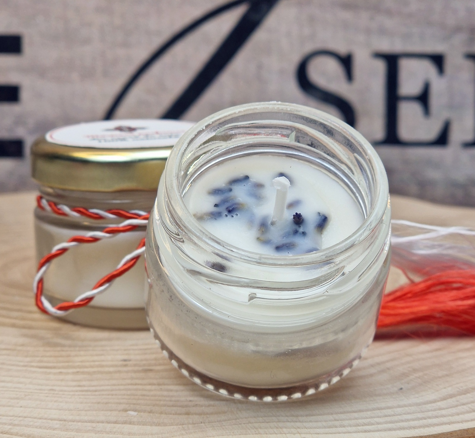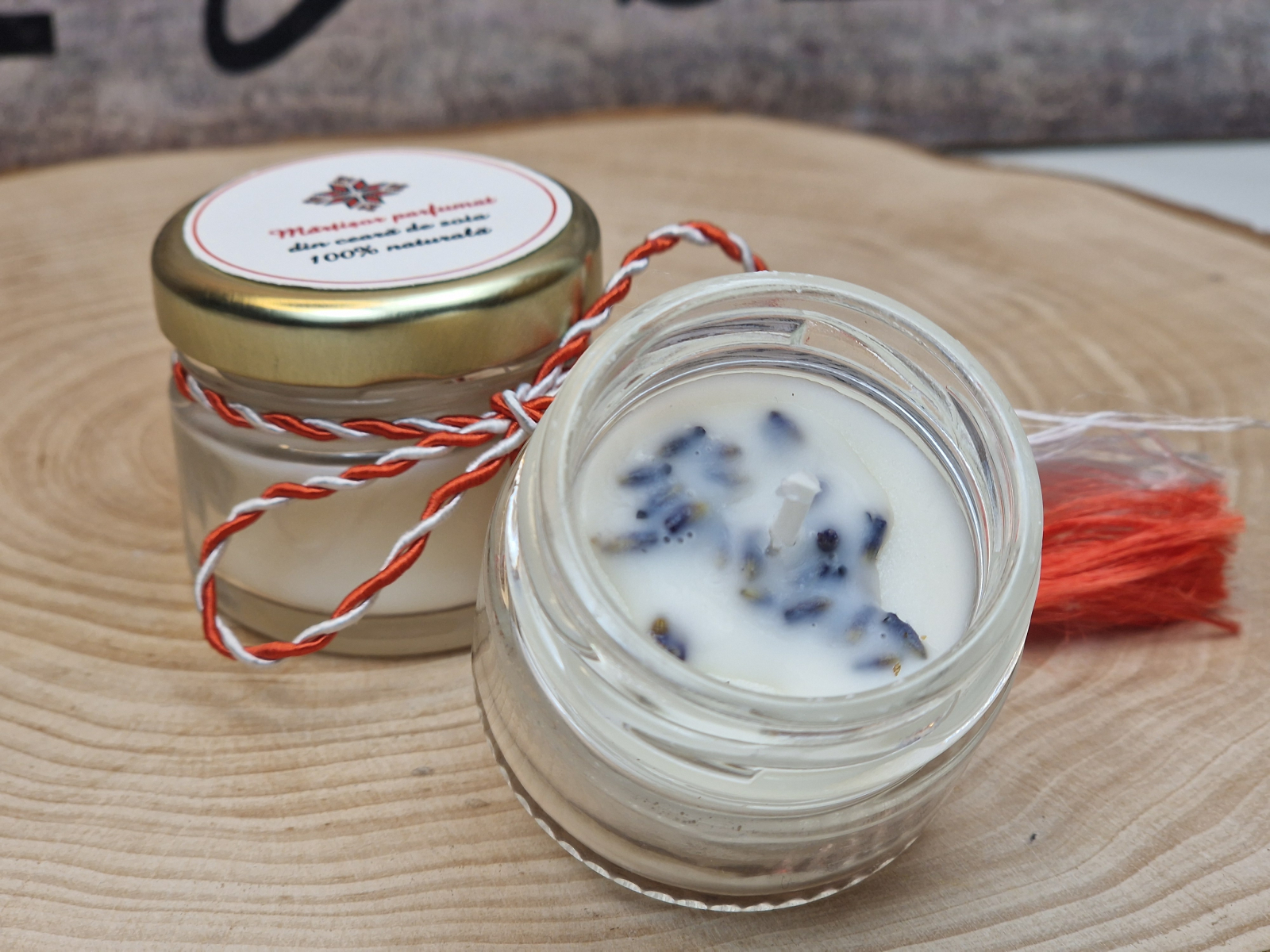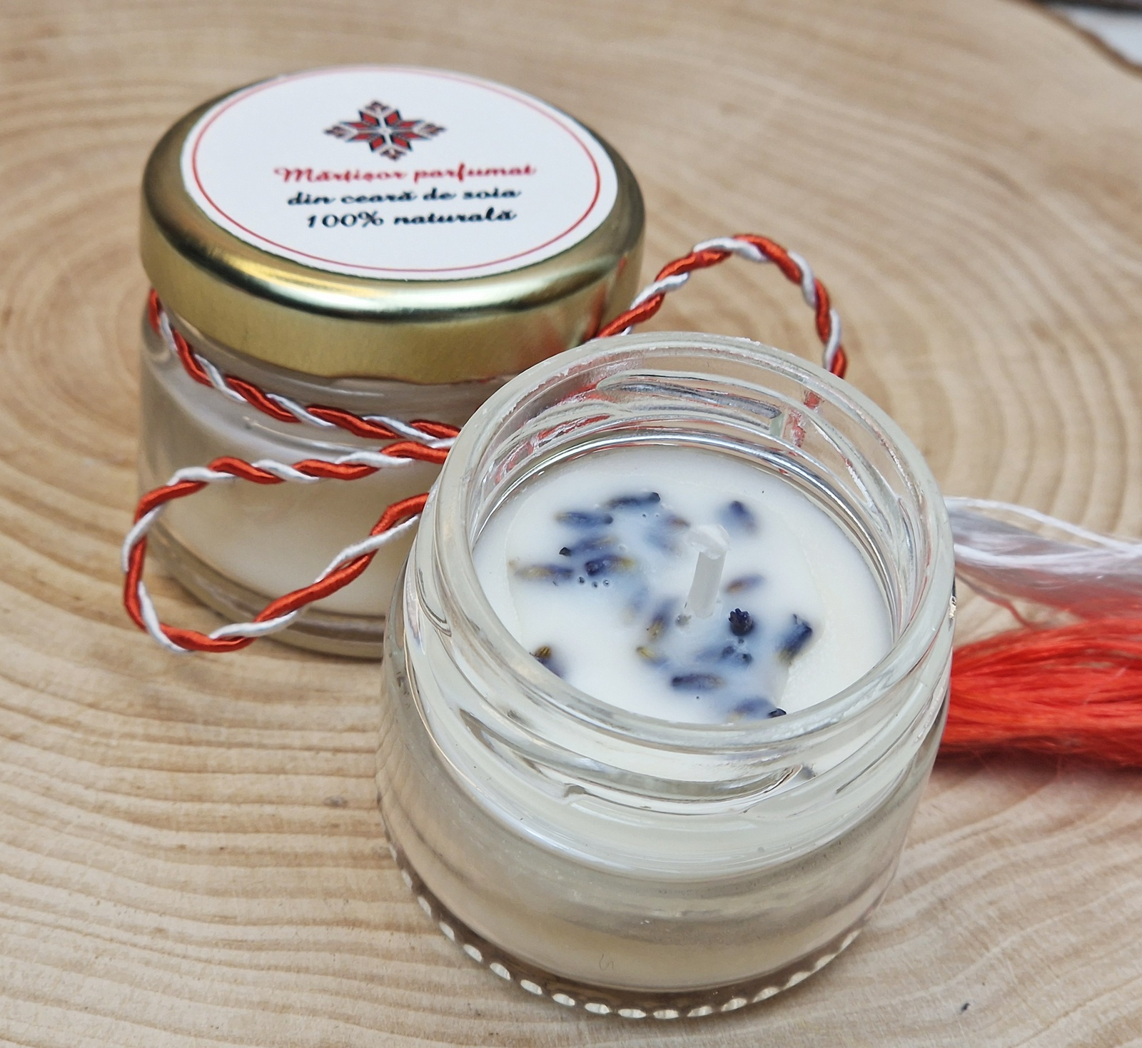 Martisor lumanare parfumata din ceara naturala de soia in borcanel de sticla.