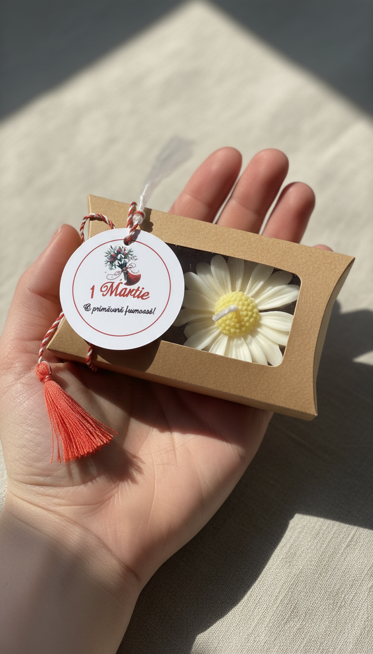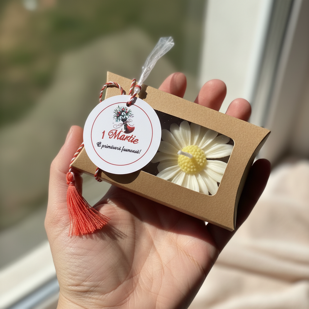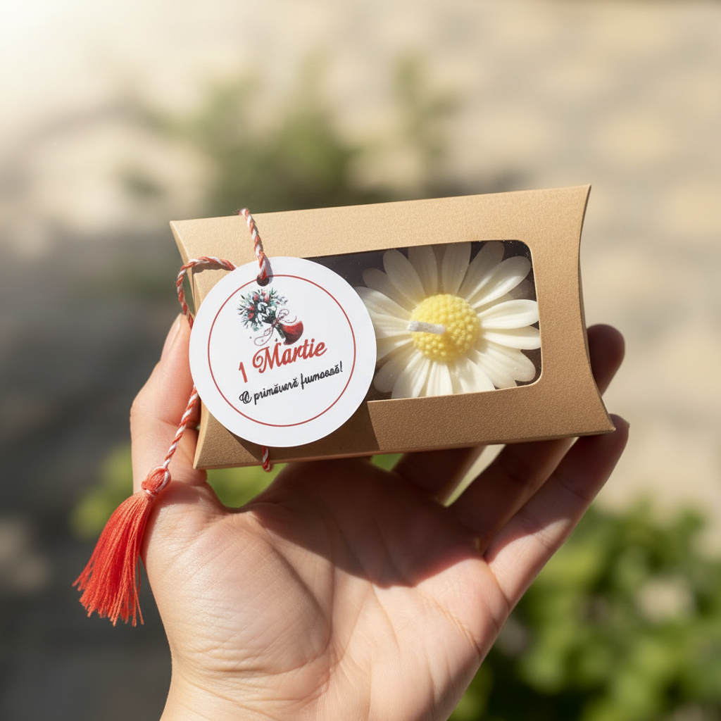 MARTISOR - lumanare in formă de margareta - simbol al primăverii cu diametru de 5,5 cm, turnată manual din ceară de soia  cu fitil din bumbac organic.Surprinde-o cu un mărțișor cu totul special- o lumânare din ceara soia ambalata elegant intr-o cutiuta de carton asortata.