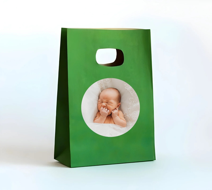 Punga pentru botez realizata din hartie verde accesorizata cu o eticheta cu fotografie