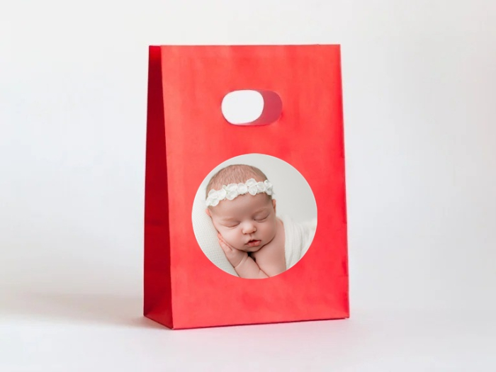 Punga pentru botez realizata din hartie rosie accesorizata cu o eticheta cu fotografie