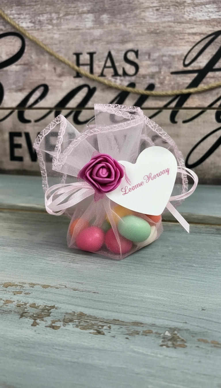 Fiecare colet va contine saculetii cu drajeuri legati exact ca in imagine, etichetele si dublu adezivul.