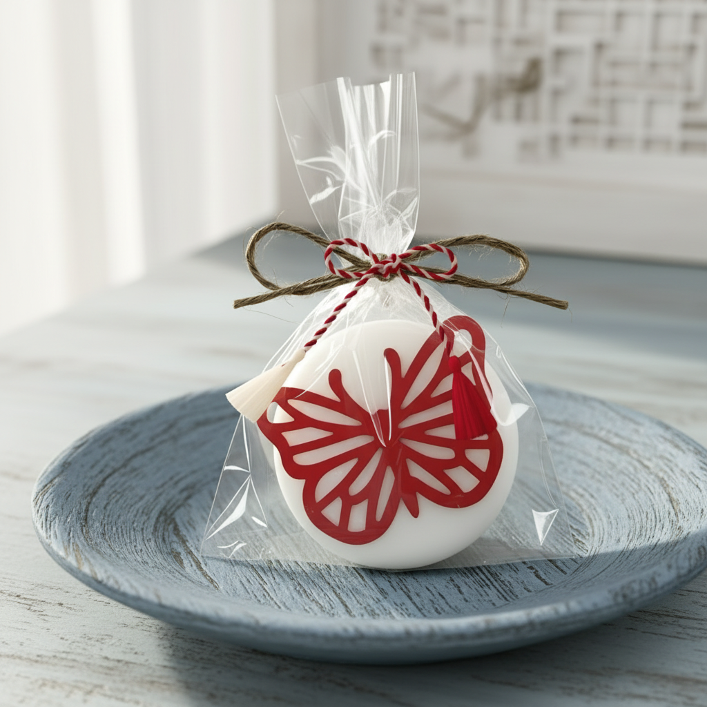 Marțișor in forma de sapun rotund accesorizat cu un fluture rosu