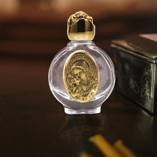 Sticluta cu capac din plastic auriu sau argintiu cu aplicatie iconita poate fi folosita ca sticluta cu mir la botezul copilului sau marturie.  Sticluta rotunda are lungimea de 4,5cm, latimea de 2cm si inaltimea de 6,5cm.
