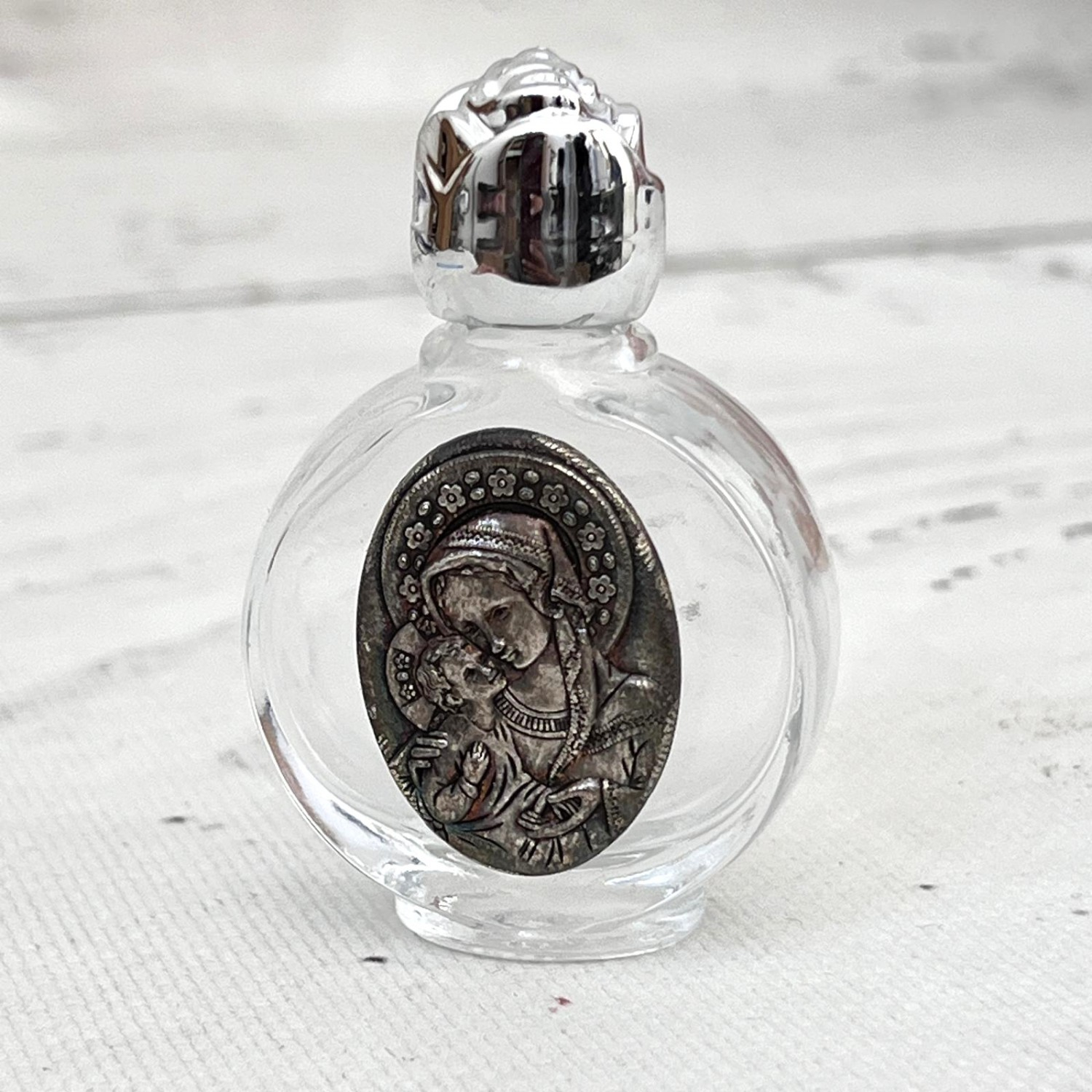 Sticluta cu capac din plastic auriu sau argintiu cu aplicatie iconita poate fi folosita ca sticluta cu mir la botezul copilului sau marturie.  Sticluta rotunda are lungimea de 4,5cm, latimea de 2cm si inaltimea de 6,5cm.