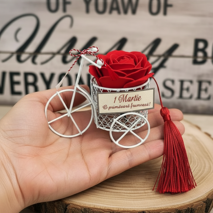 MARTISOR - bicicleta din sarma alba cu un trandafir rosu din sapun parfumat