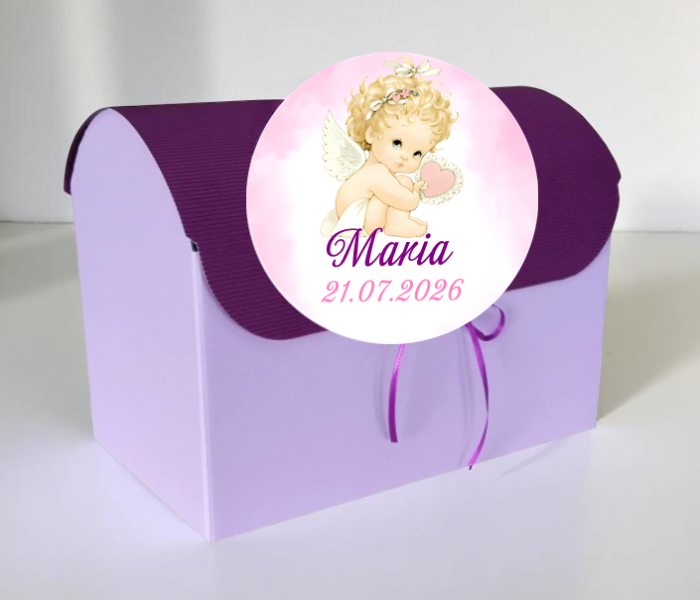 Optional, cufarul poate fi personalizat cu o placuta din carton alb prevazuta cu dublu adeziv si personalizata cu numele bebelusului si data evenimentului.