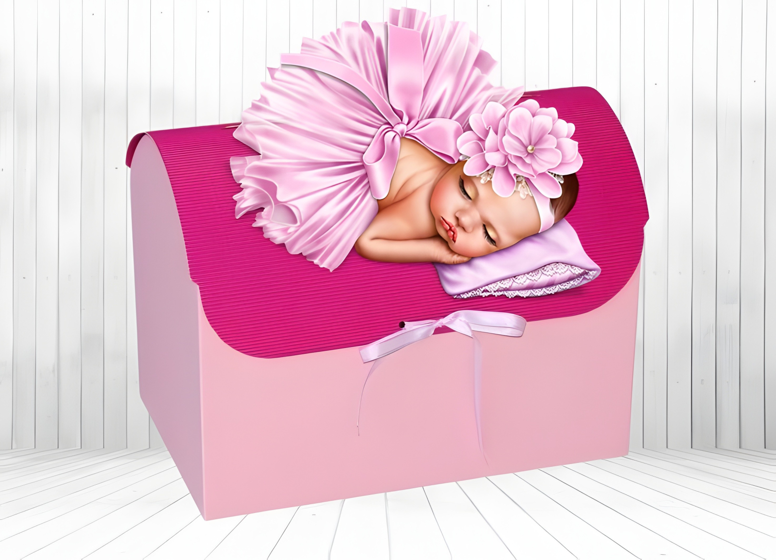 Optional, cufarul poate fi personalizat cu o placuta din carton prevazuta cu dublu adeziv si personalizata cu numele bebelusului si data eveniementului.