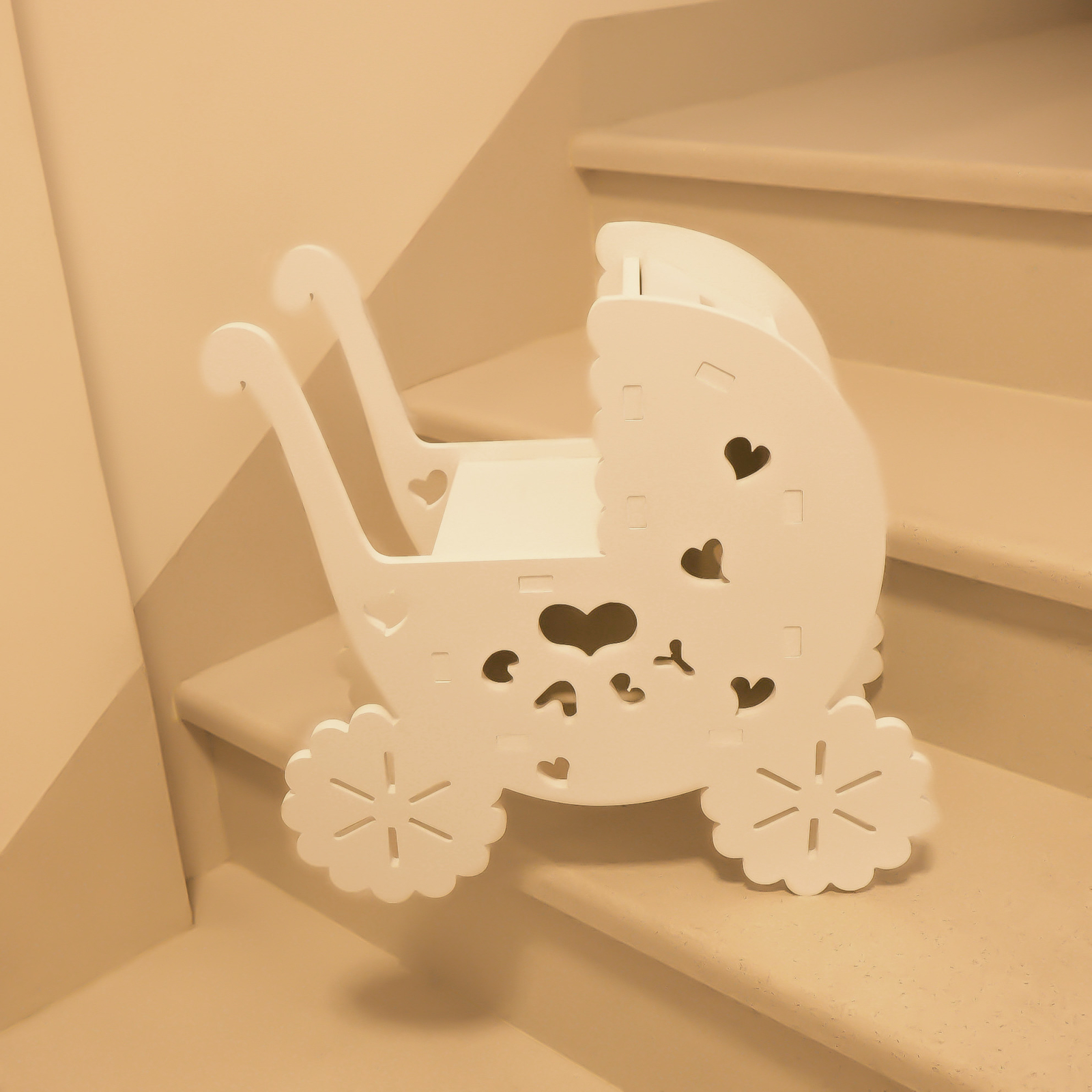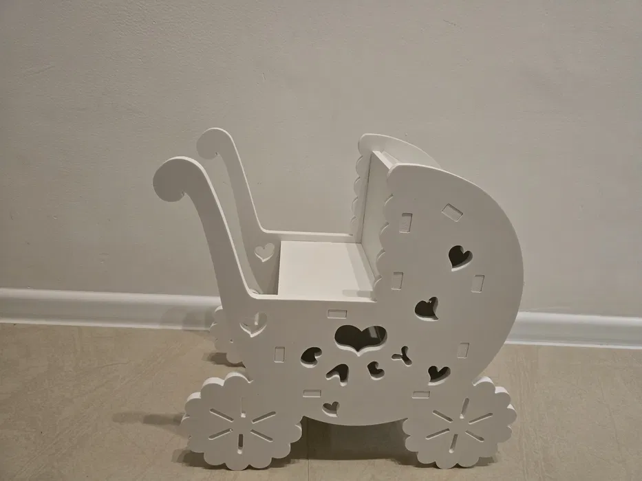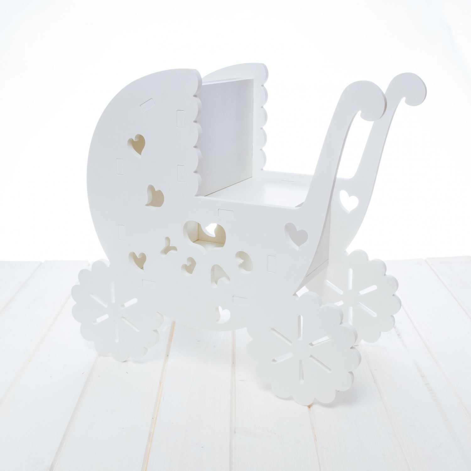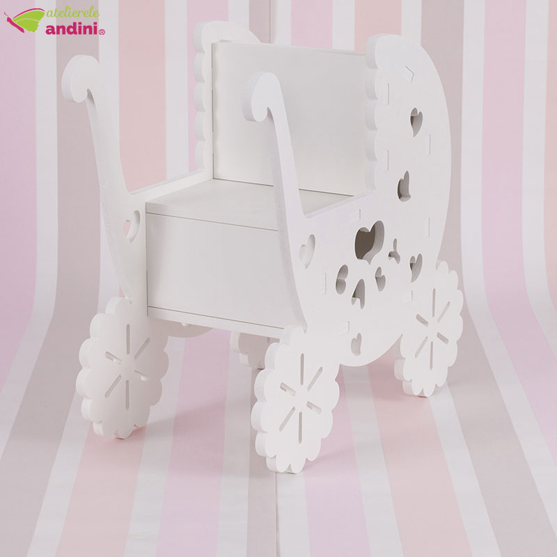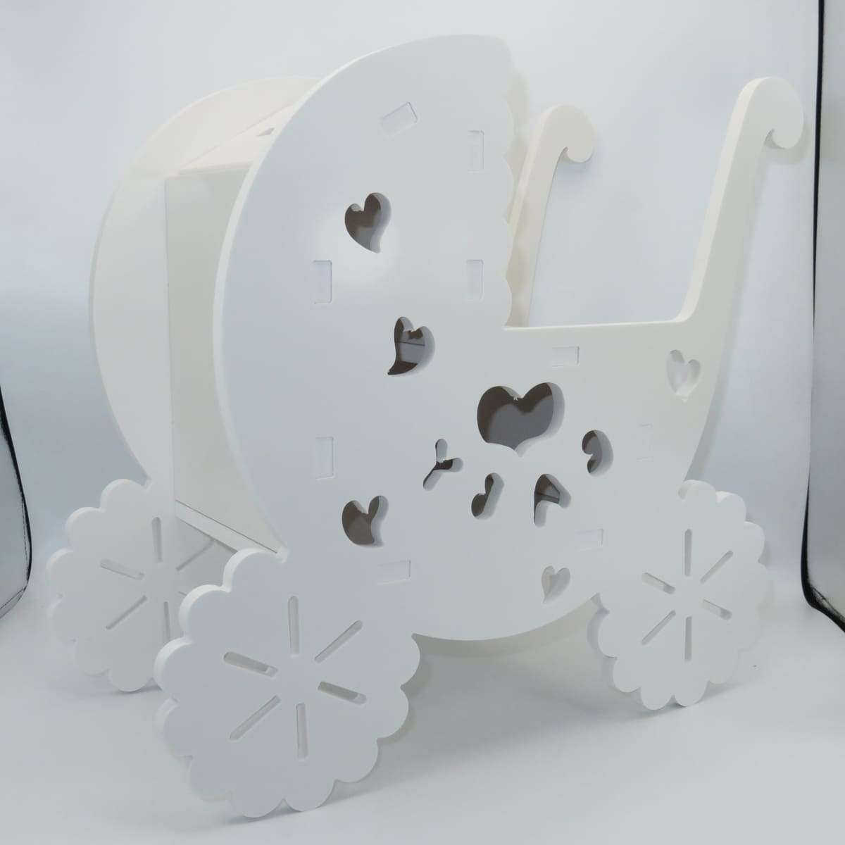 Casuta de bani din plastic alb perforata in forma de carucior are inaltimea de 39cm, latimea de 26 cm si lungimea de 37cm.