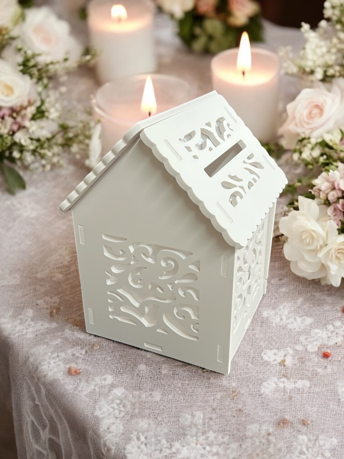 Cutia de dar pentru nunta in forma de casuta este decorată cu un design frumos dantelat.