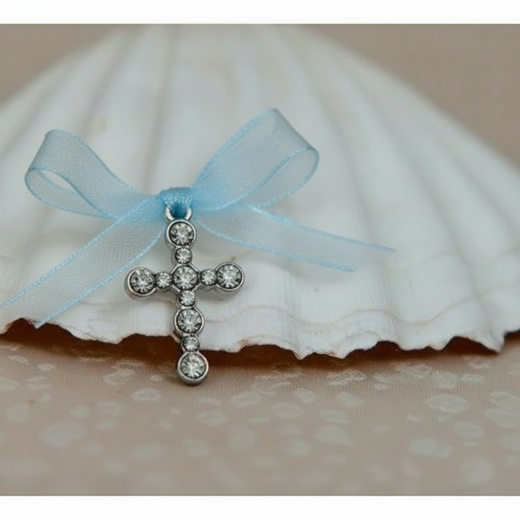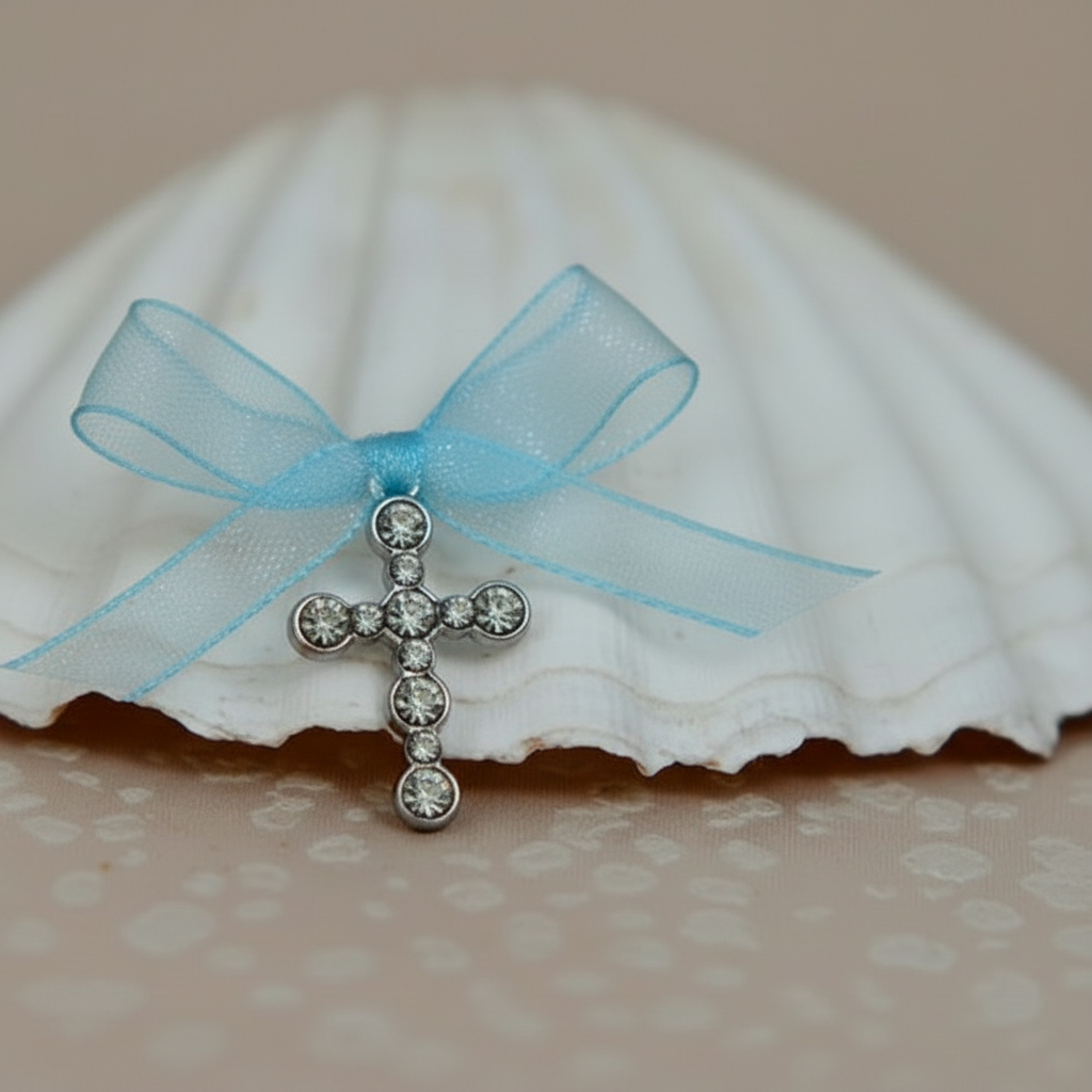 Cruciulite de botez cu forma deosebita special concepute pentru botezul micutului dvs. Cruciulitele sunt realizate din metal nichelat si strasuri (pietricele albe) sunt accesorizate cu fundite din organza de diferite culori. In cadrul slujbei de botez, fiecare invitat primeste o cruciulia de botez accesorizata cu o fundita colorata.