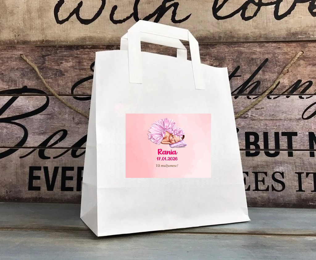 Punga este accesorizata cu o eticheta personalizata cu numele copilului si data evenimentului.