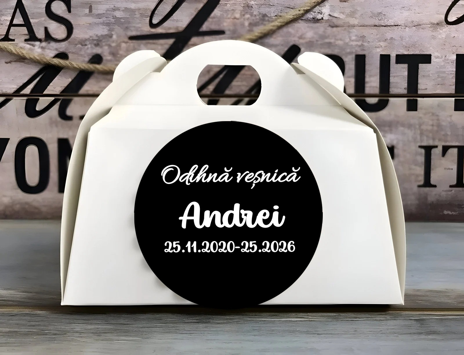 Optional, cutia poate fi personalizata cu o eticheta cu nume decedatului si data comemorării.