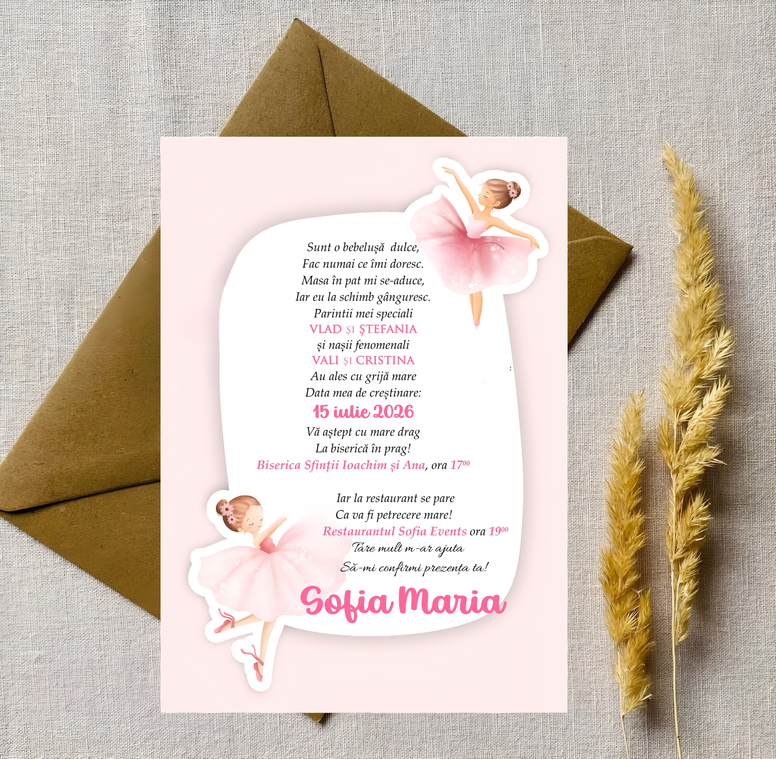 Invitatie de botez cu tematica BALERINA realizata din carton ALB sidefat gros (250 gr)