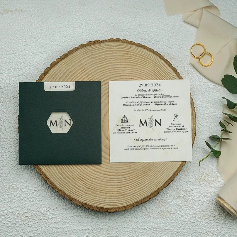 Invitatii de nunta confectionate dintr-un carton crem mat cu model floral si un plic verde cu decupaj central.