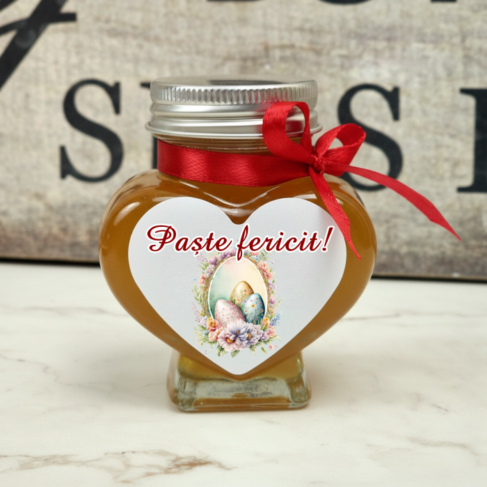 Borcanasul cu miere este accesorizat cu eticheta in forma de inima cu mesaj de pascal si o fundita rosie de satin.