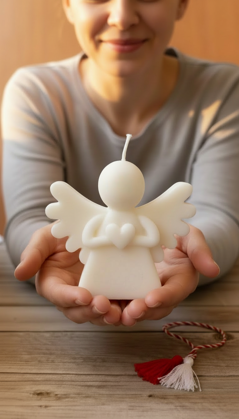 Surprinde-o cu un martisor - lumanare din ceara de soia in forma de INGERAS ambalata elegant într-o cutie kraft cu fereastră.