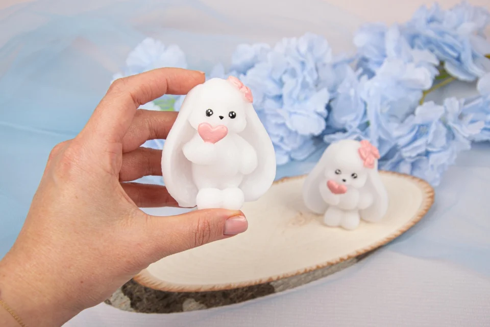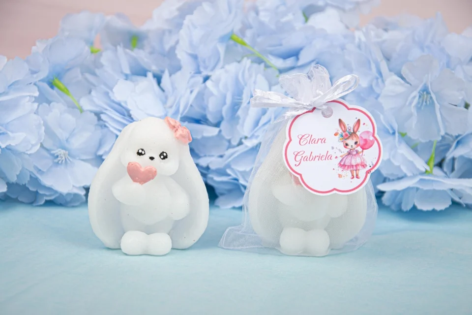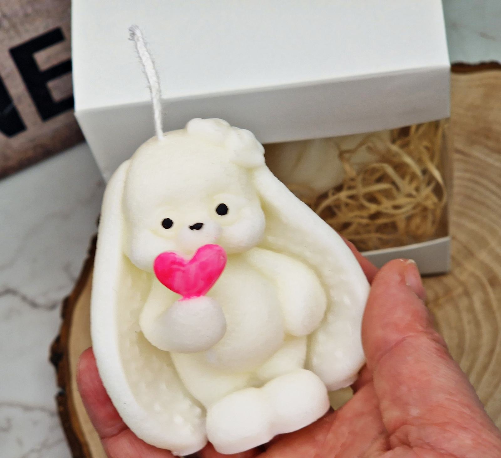 lumânare din ceara soia in forma de IEPURAȘ ambalata elegant într-o cutie albă cu fereastră.