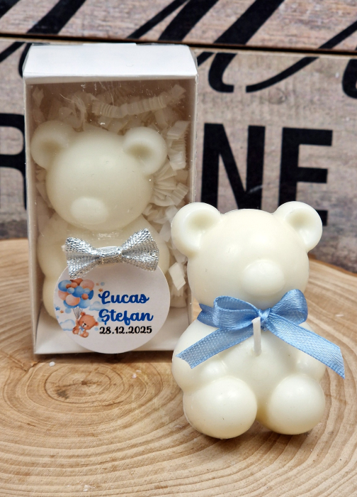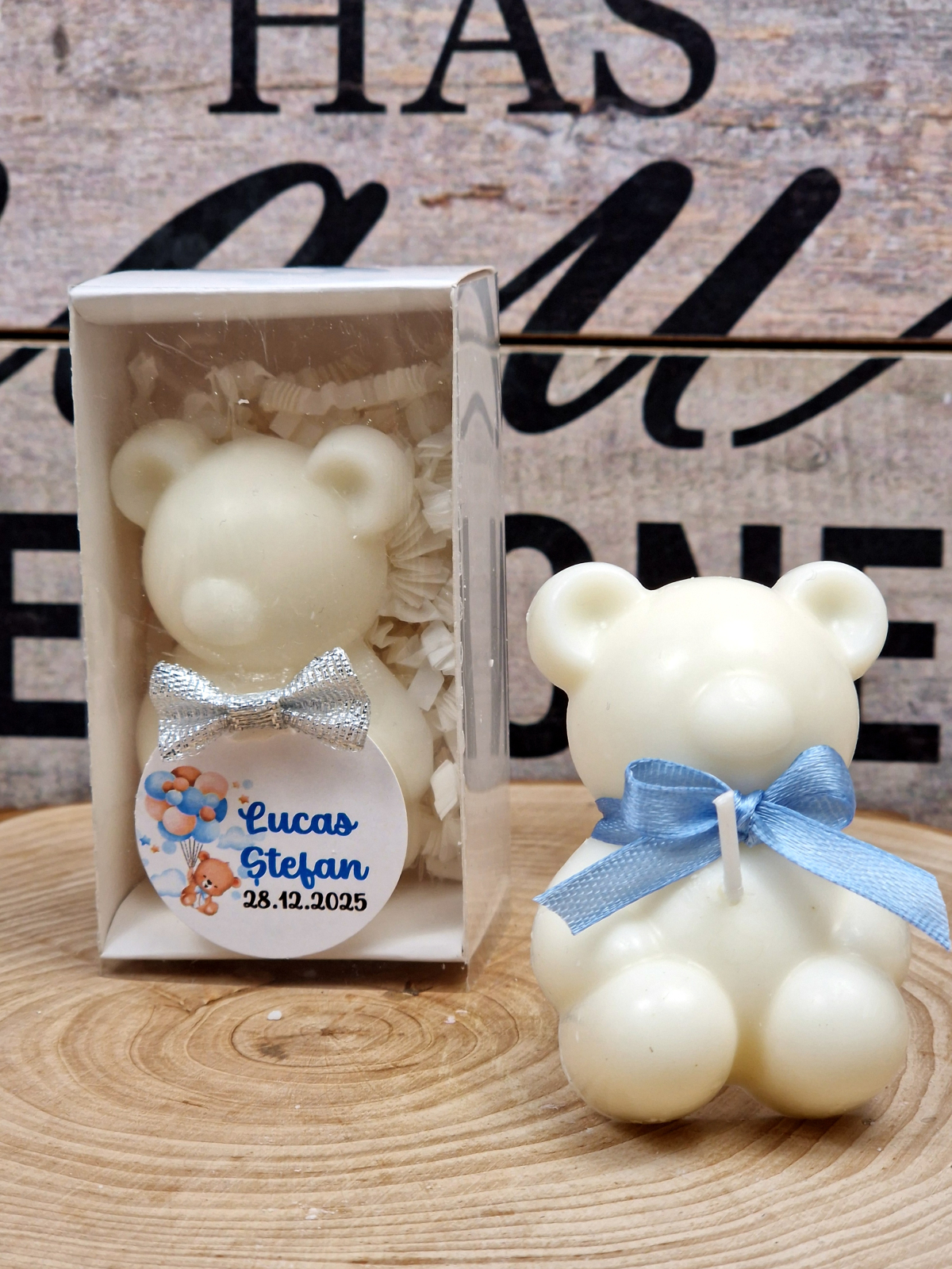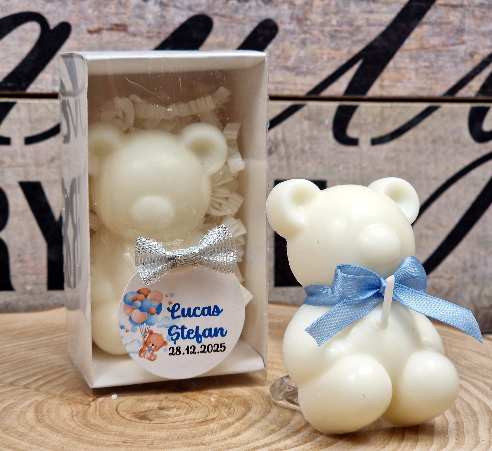 lumânare din ceara soia in forma de ursulet personalizata si ambalata elegant.in cutie cu capac transparent