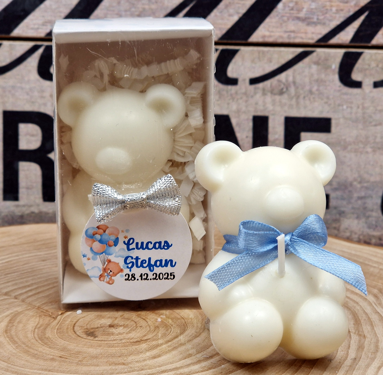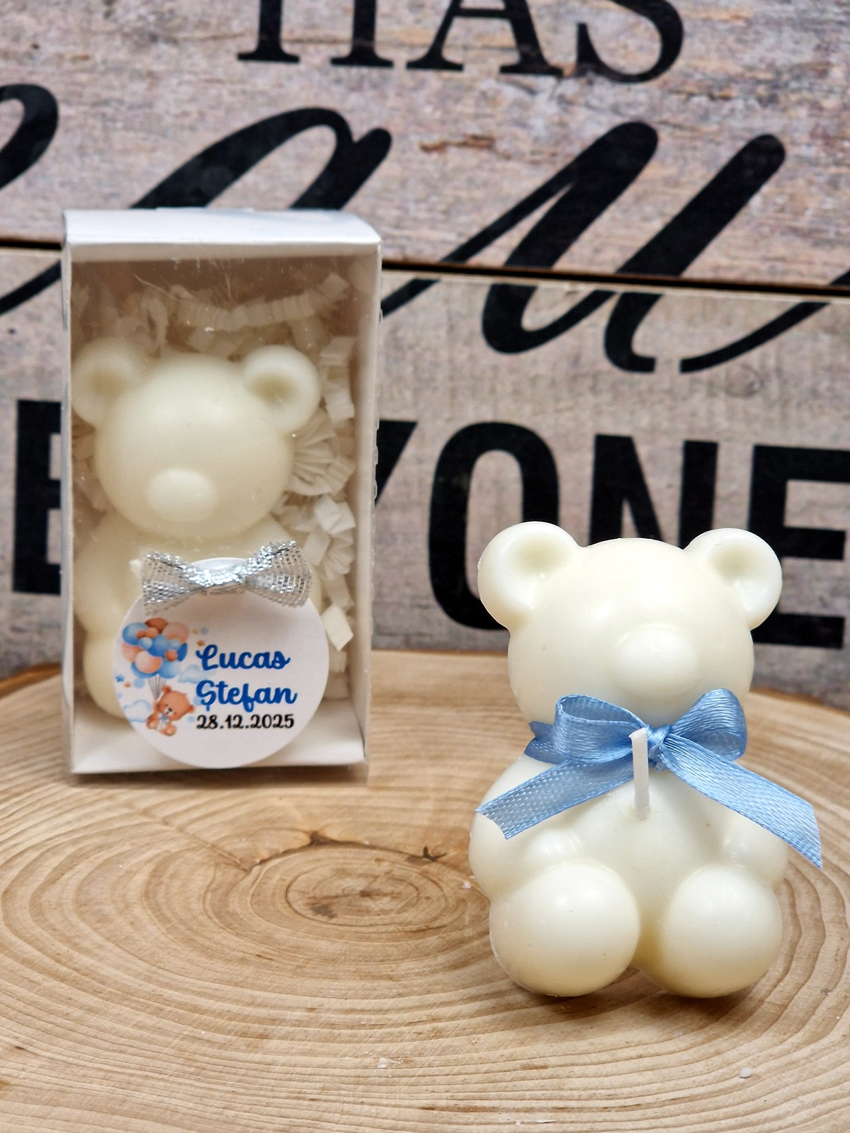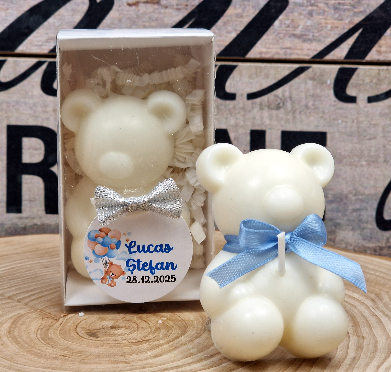 lumânare din ceara soia in forma de ursulet personalizata si ambalata elegant.in cutie cu capac transparent