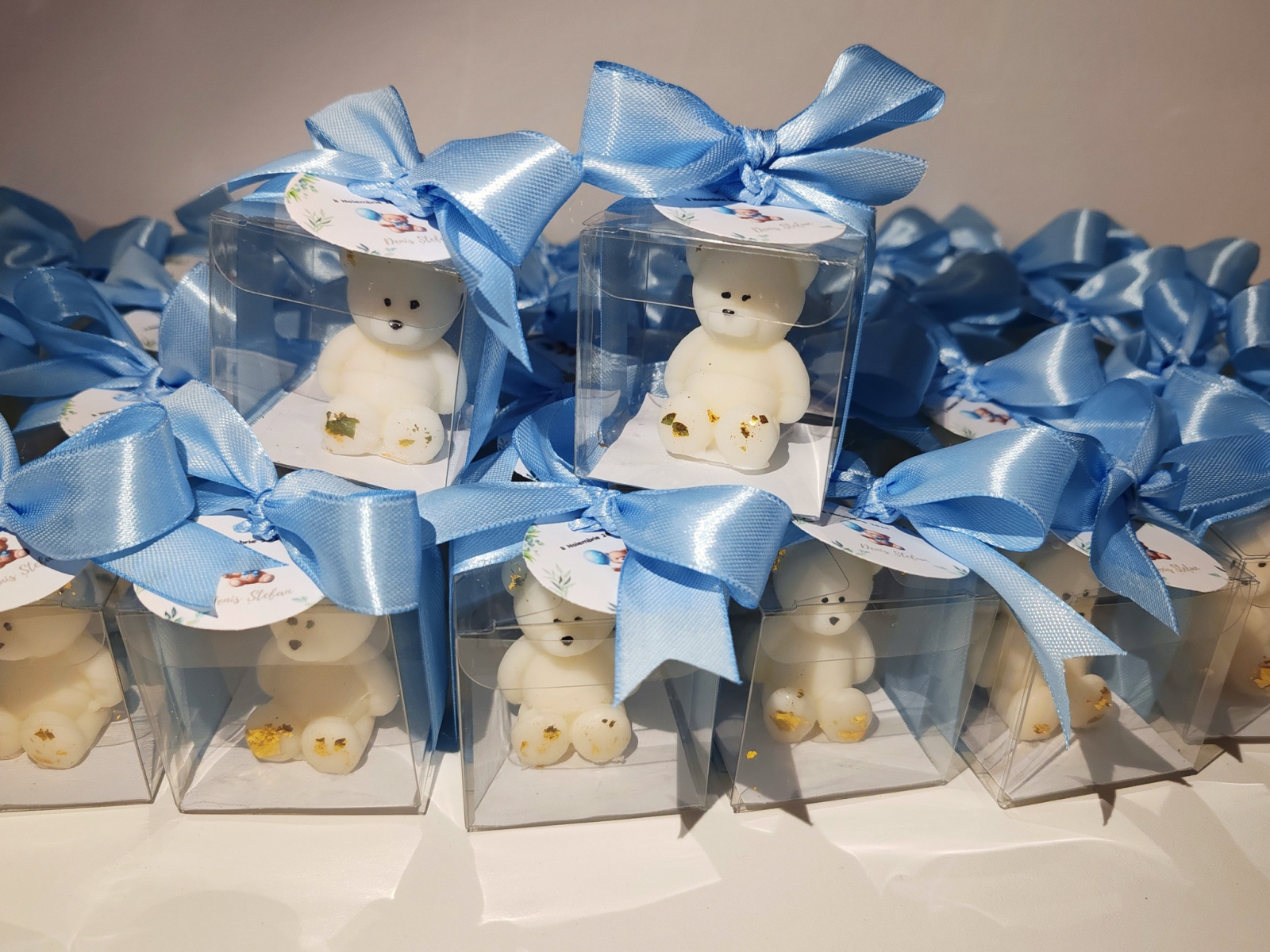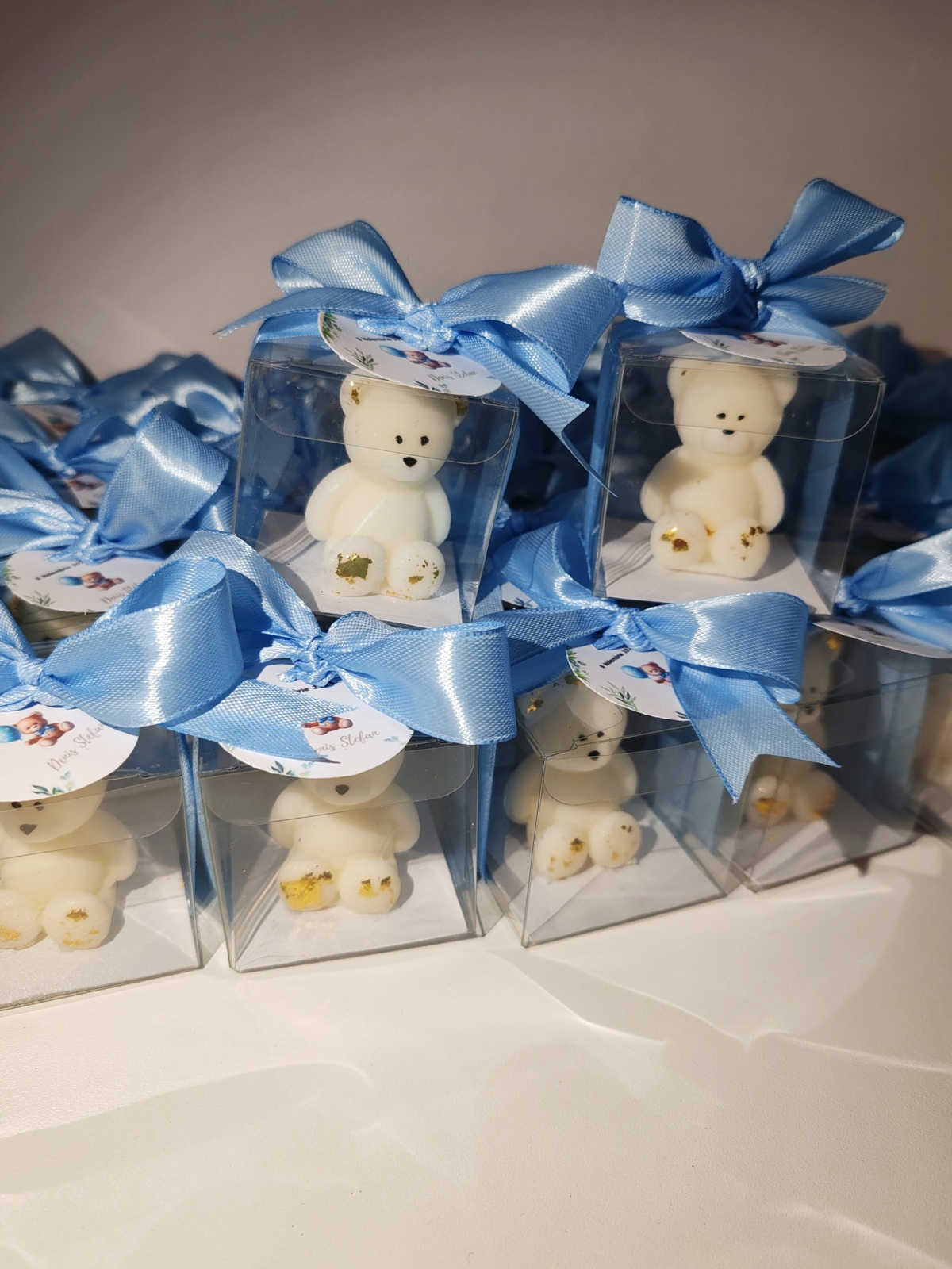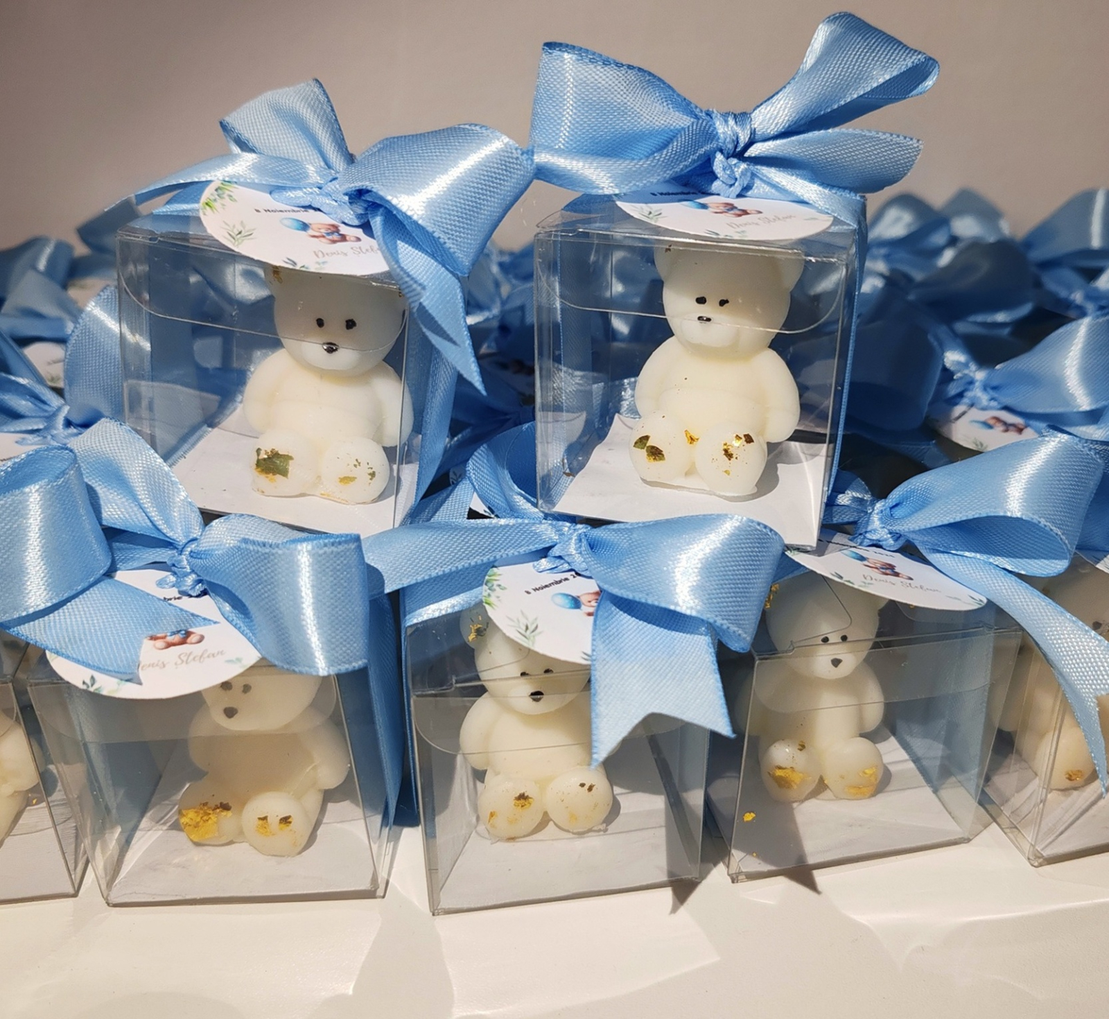 lumânare din ceara soia in forma de ursulet personalizata si ambalata elegant.
