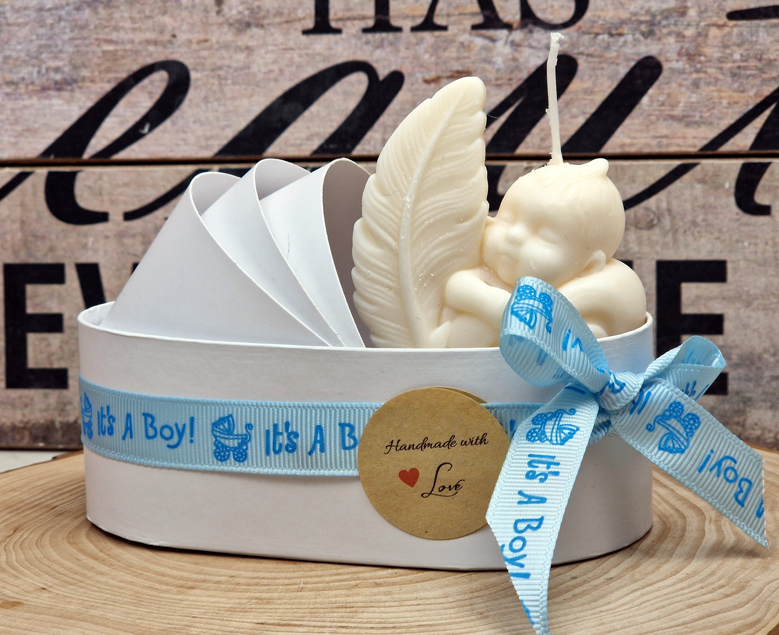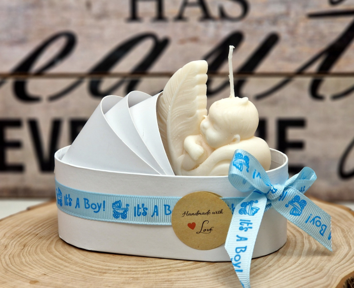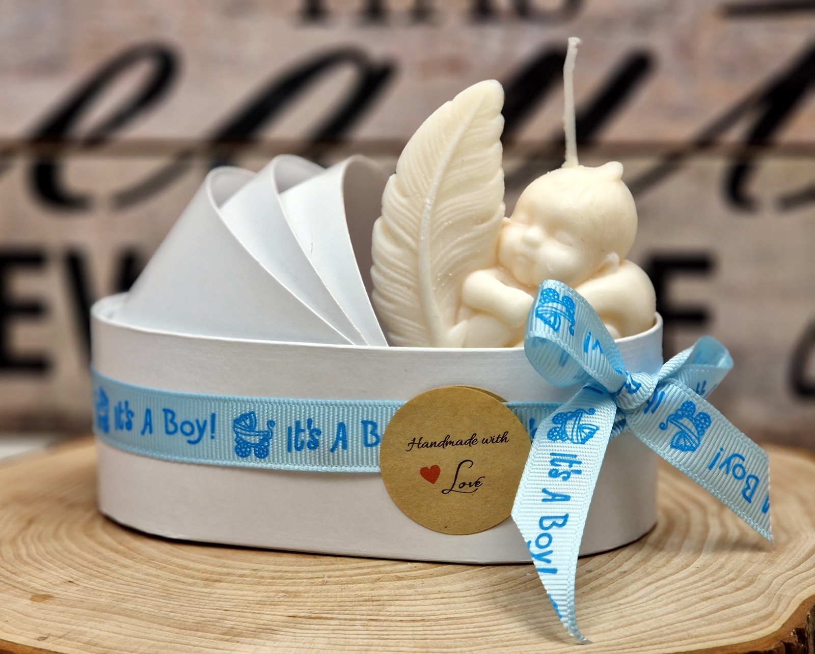 O lumanare  in forma de bebe ingeras este ambalat cu grija intr-o cutie in forma de landou.