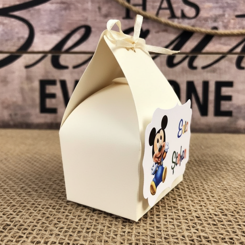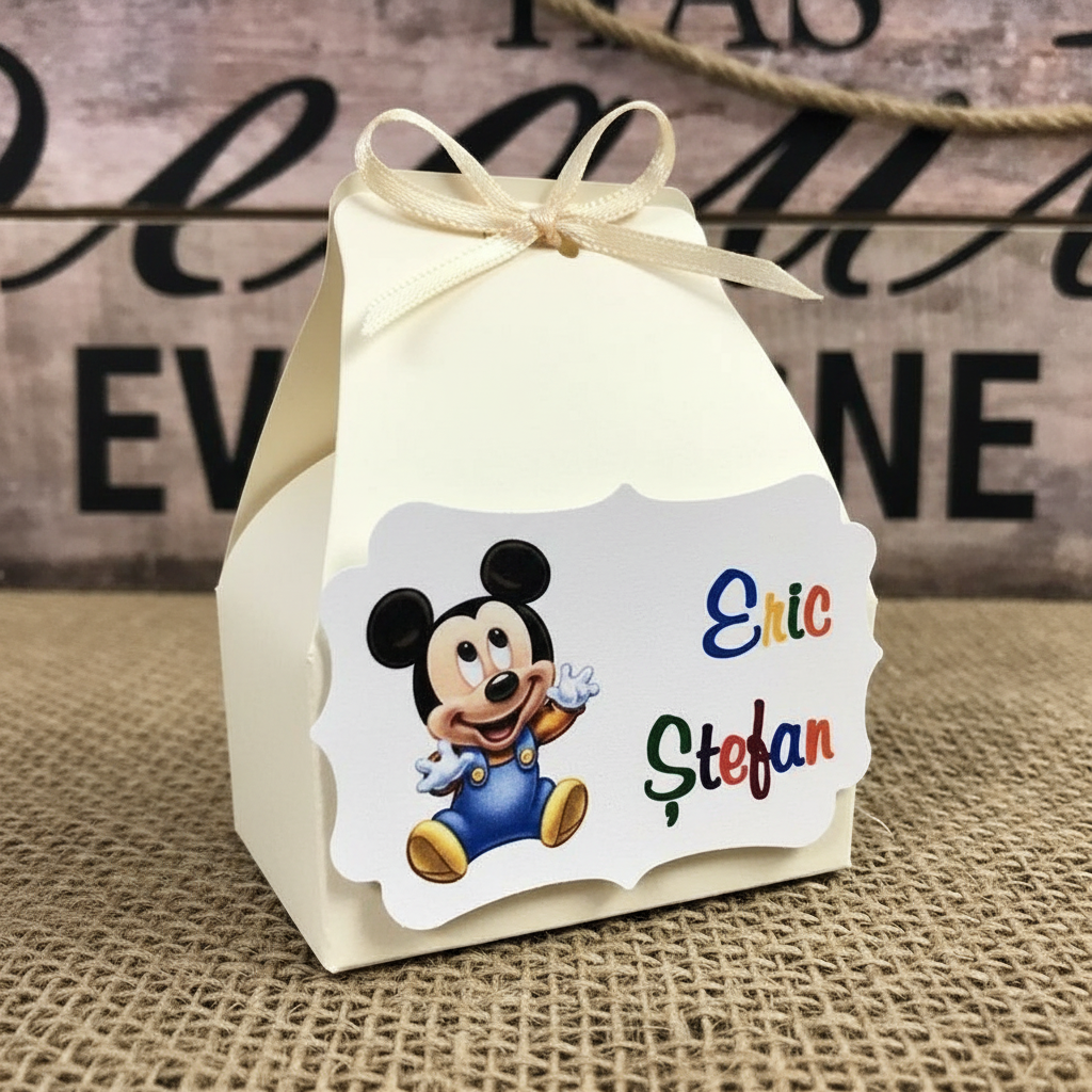 Cutiuta din carton BLUE. Se inchide cu un snurulet asortat din satin. Este personalizata cu o eticheta din colectia Mickey Mouse cu numele bebelusului si data botezului.