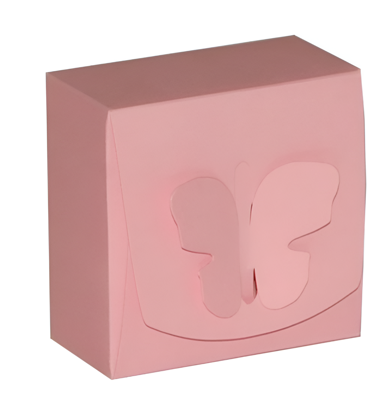 Cutiuta din carton roz cu inchidere in forma de fluturas.