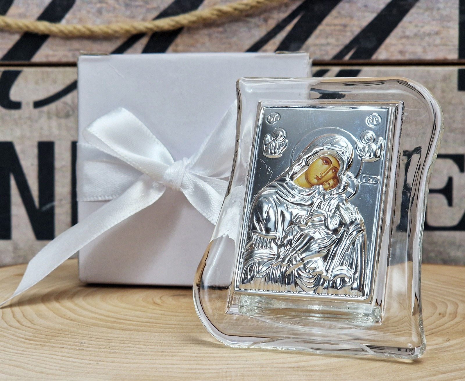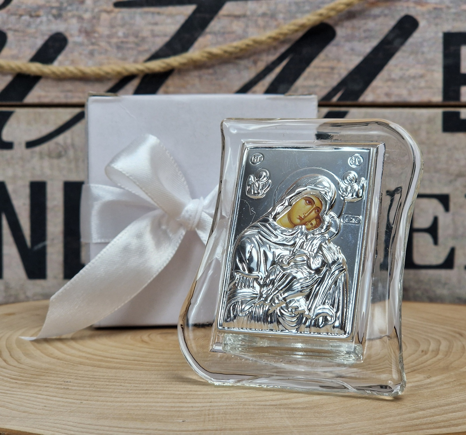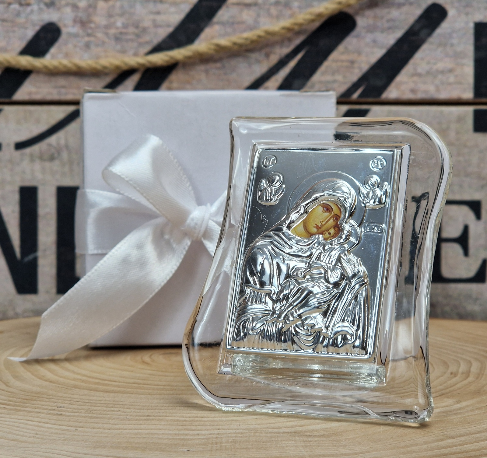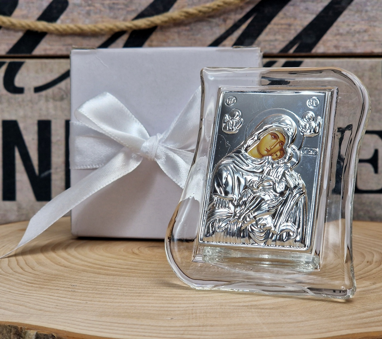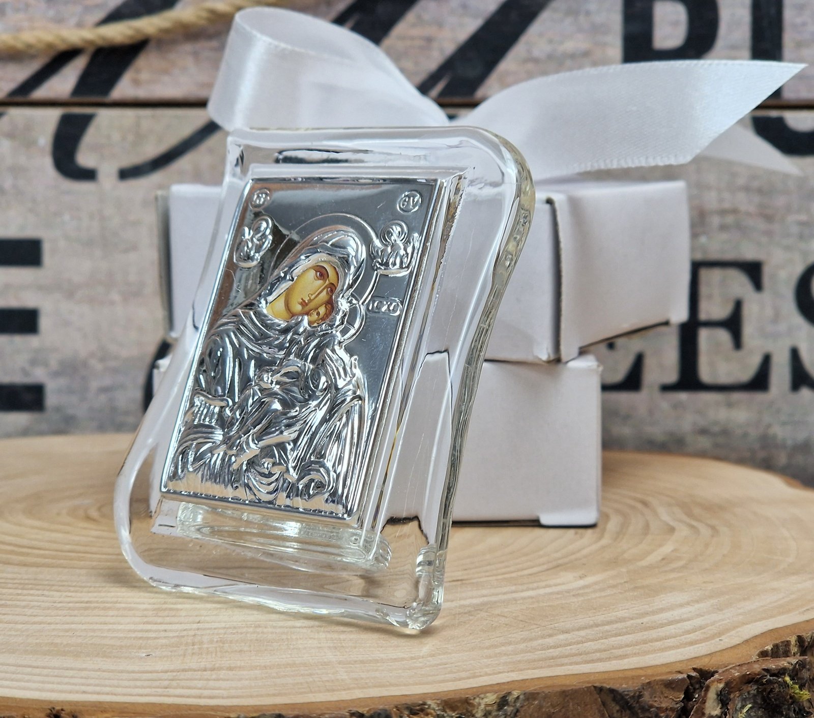 Iconita Maica Domnului pe suport de sticla transparent